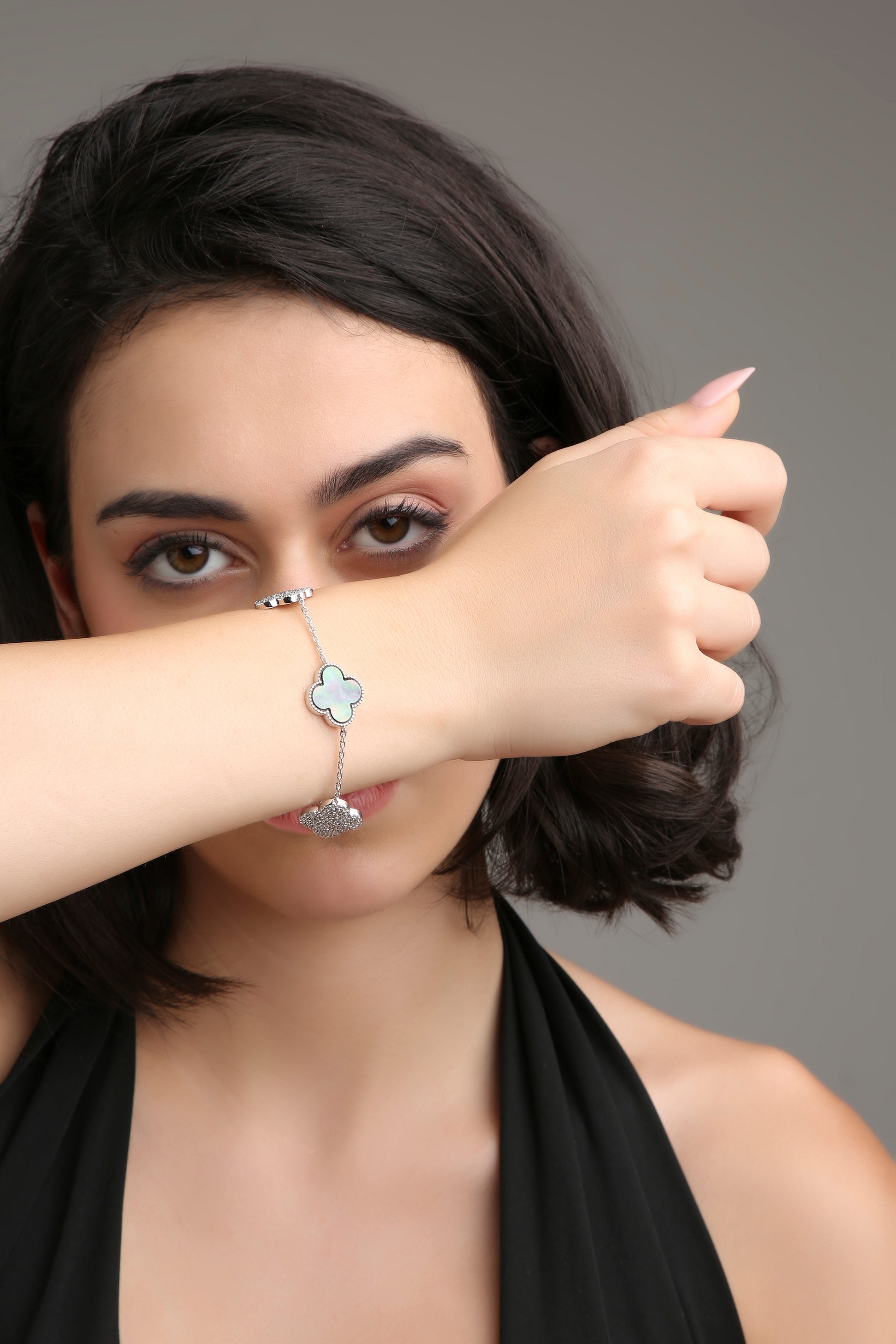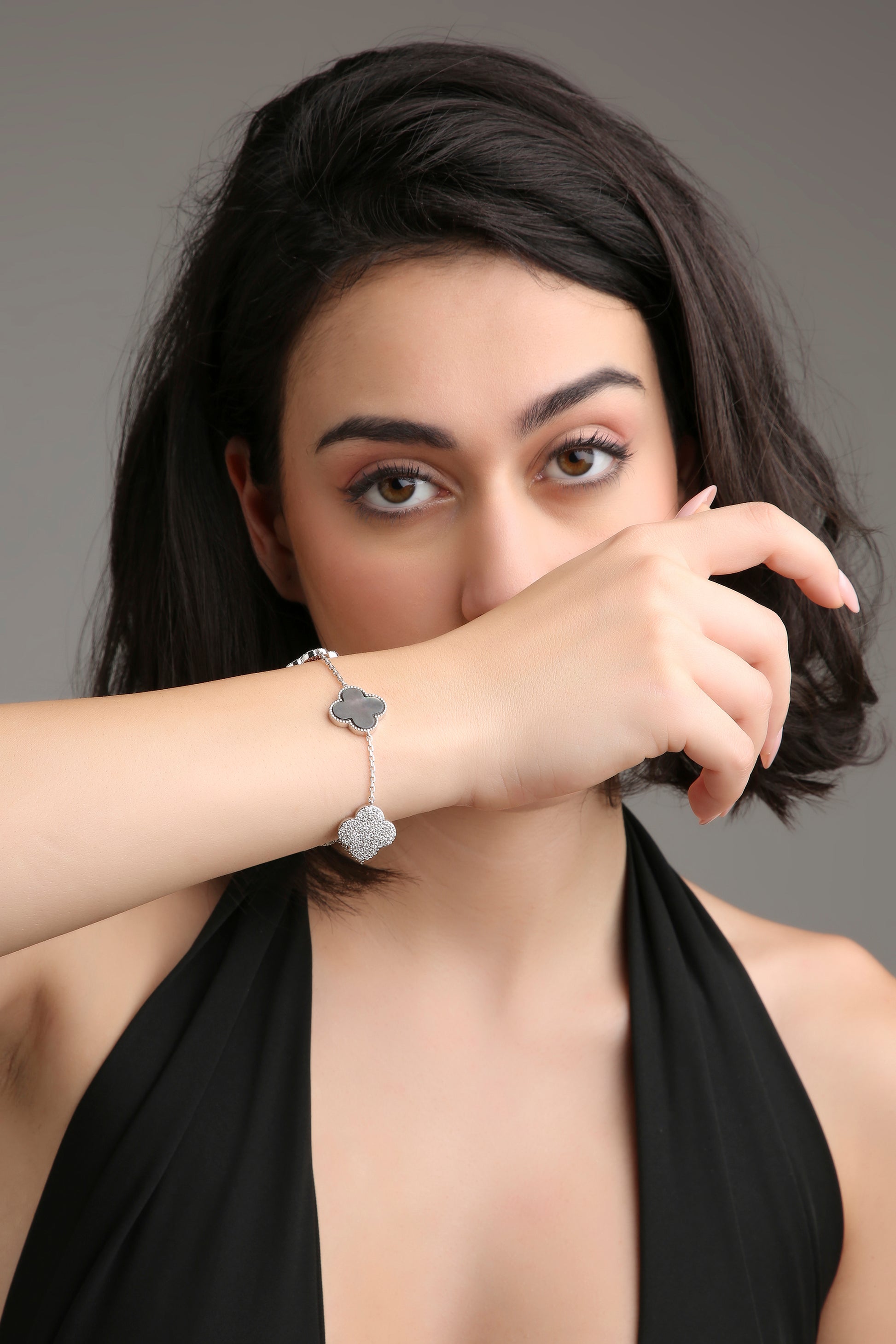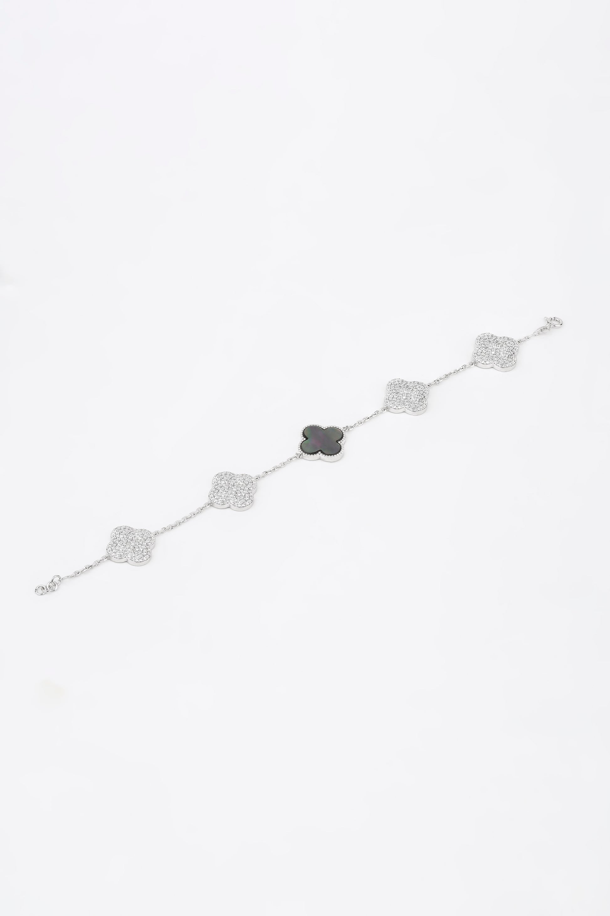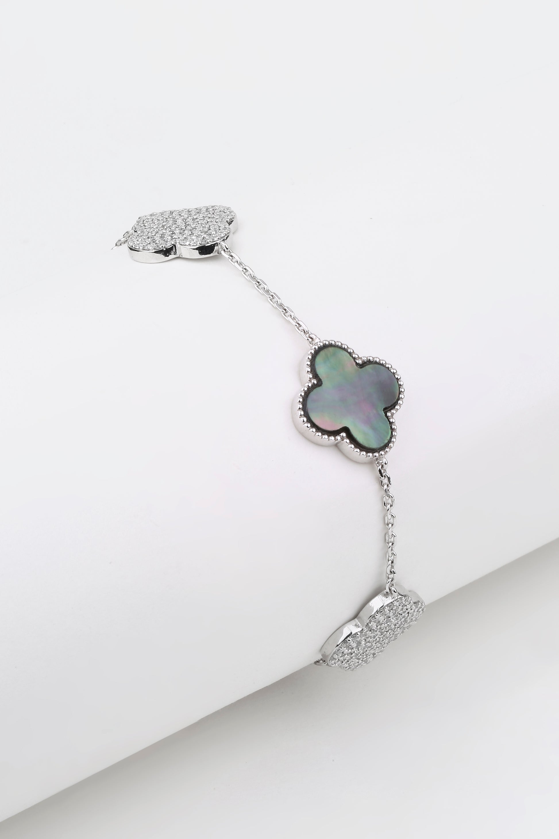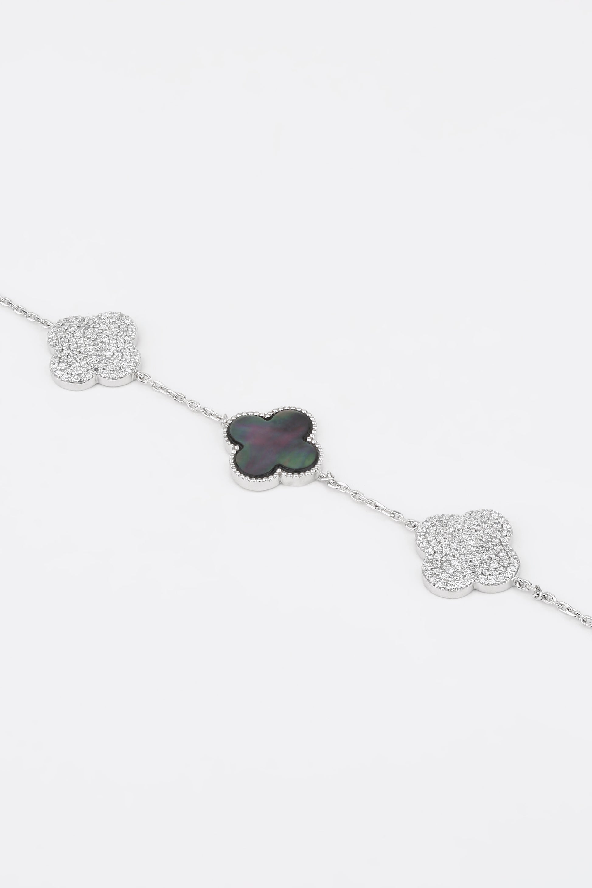 The Bloom Mirage bracelet captures the ethereal beauty of shifting light and shadow. Designed with a lustrous clover motif in iridescent mother-of-pearl, framed by shimmering diamond-studded accents, it reflects elegance that feels almost dreamlike. Delicate yet striking, this bracelet is a symbol of grace that changes with every glance — just like the woman who wears it.