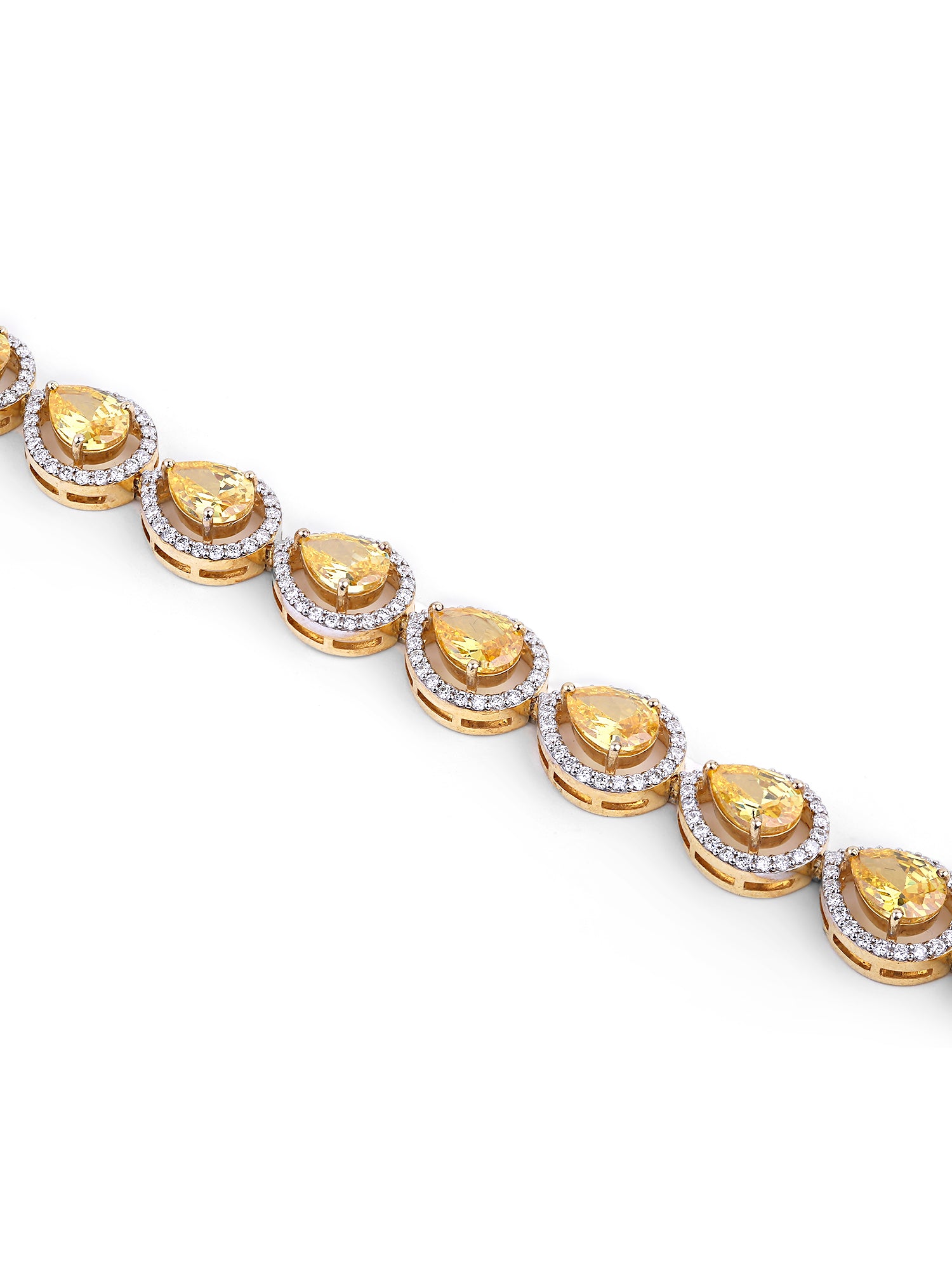 The Bloom Solis bracelet radiates golden warmth and timeless luxury. Featuring pear-shaped yellow gemstones surrounded by halos of shimmering diamonds, each element reflects the brilliance of the sun at its peak. Set in a glowing gold finish, this bracelet embodies light, optimism, and elegance — a luminous statement for those who shine effortlessly.