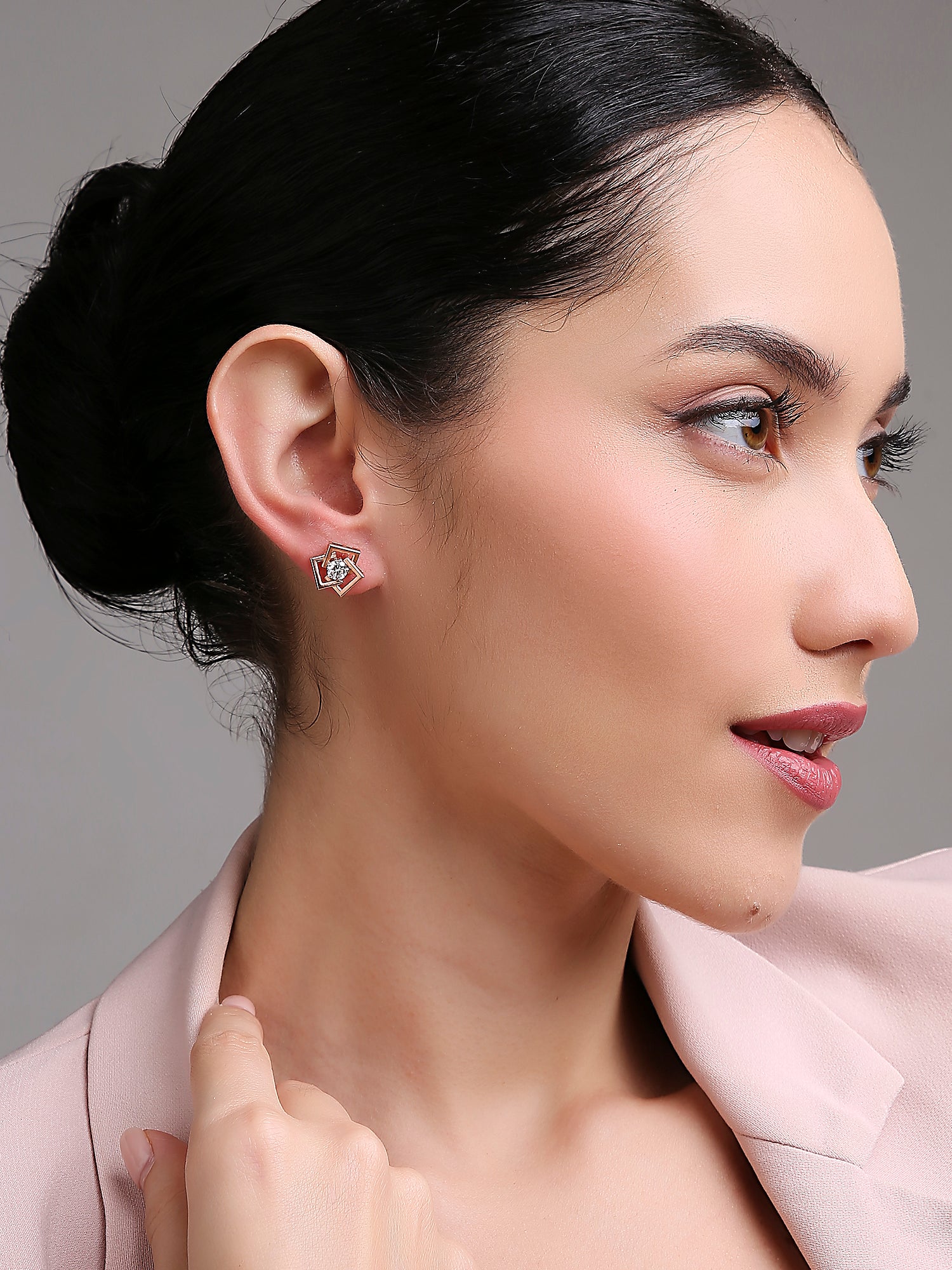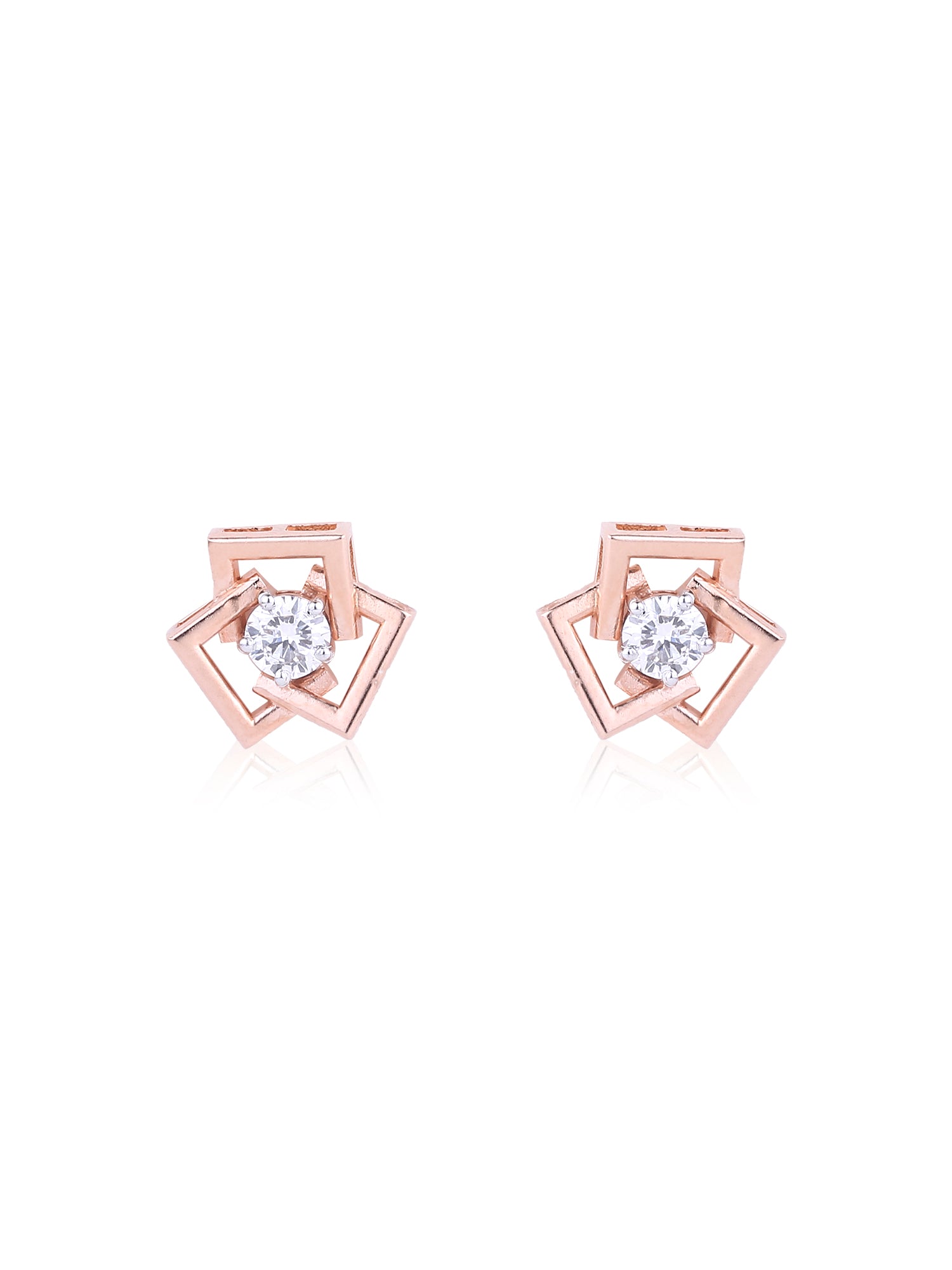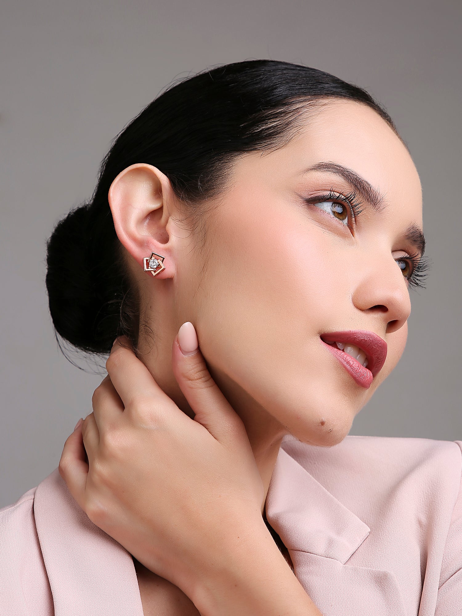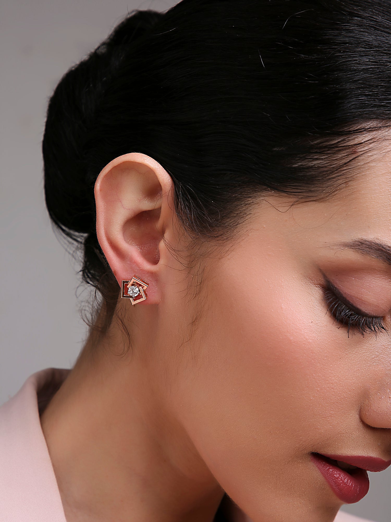 The Evora Prism earrings redefine modern minimalism with their geometric rose gold frame encasing a brilliant round-cut diamond at the center. Designed for those who love structure with a hint of sparkle, these studs embody balance, clarity, and sophistication — perfect for elevating both day and night looks.