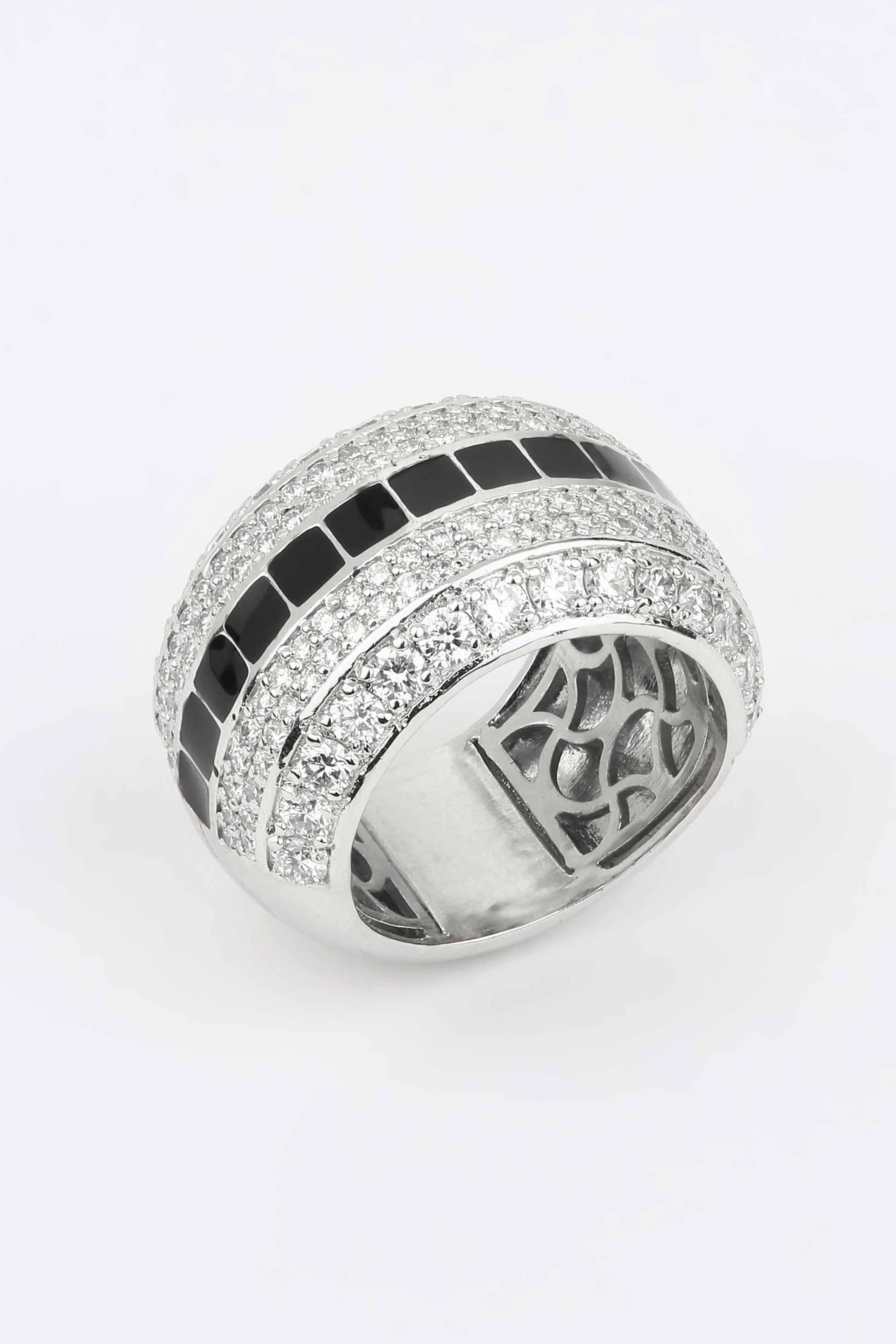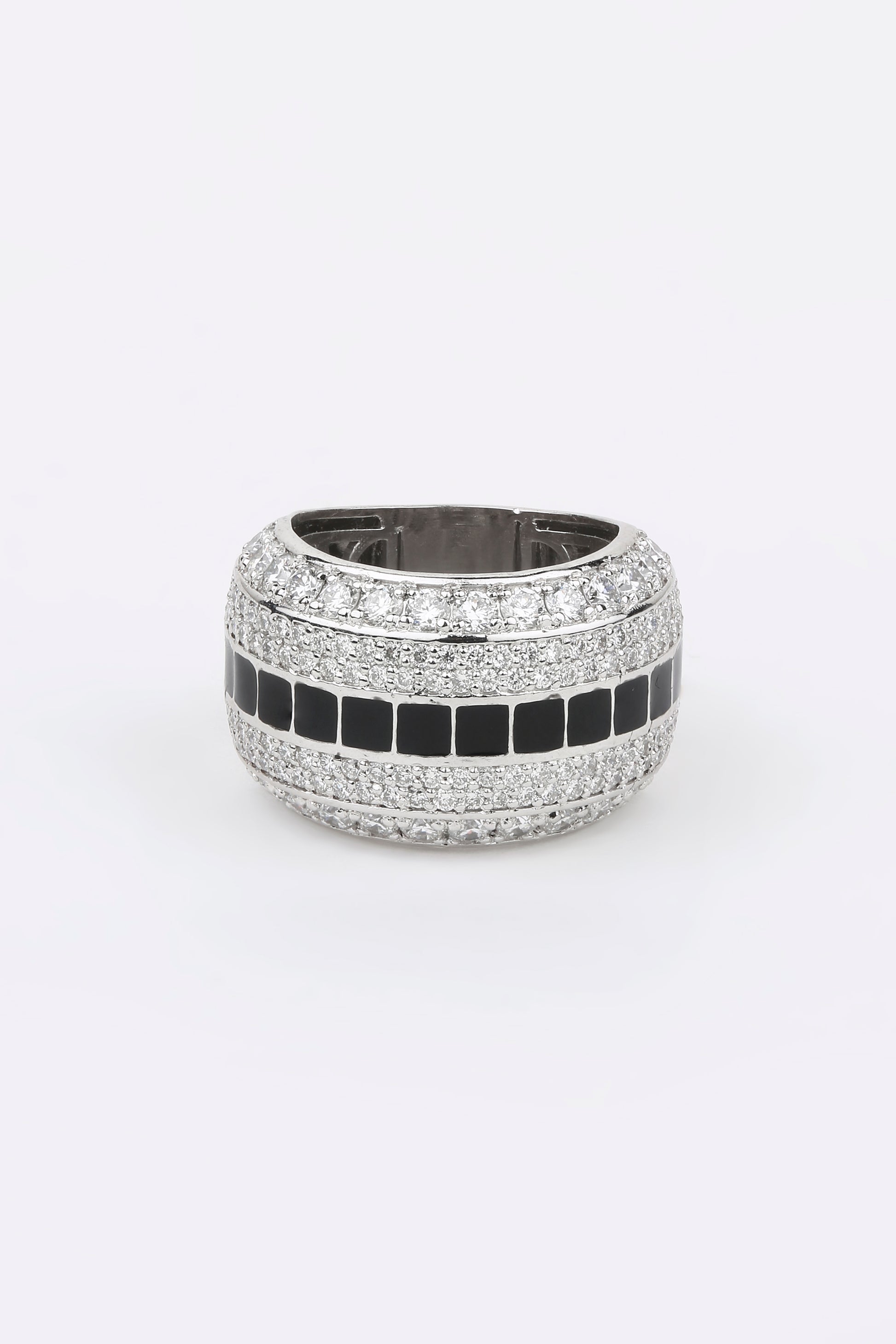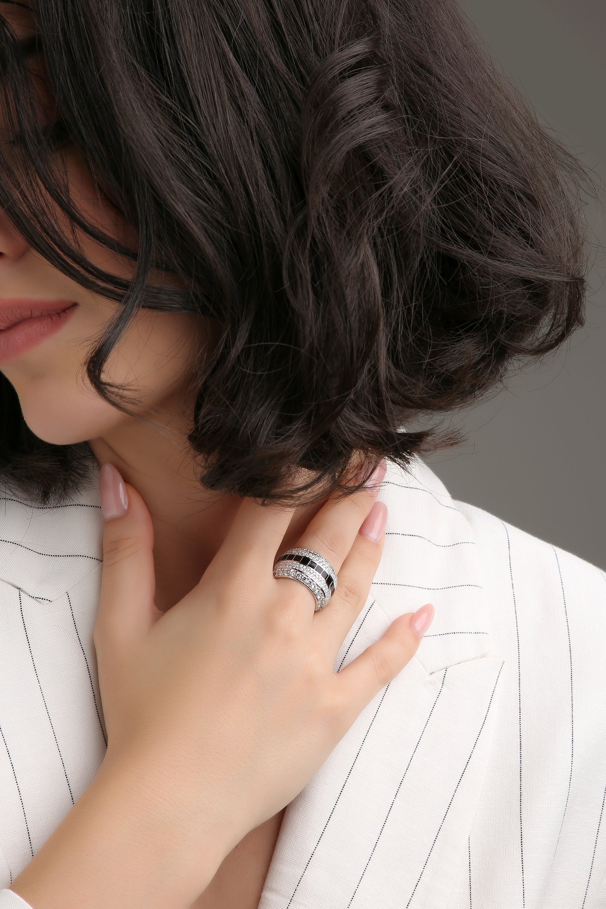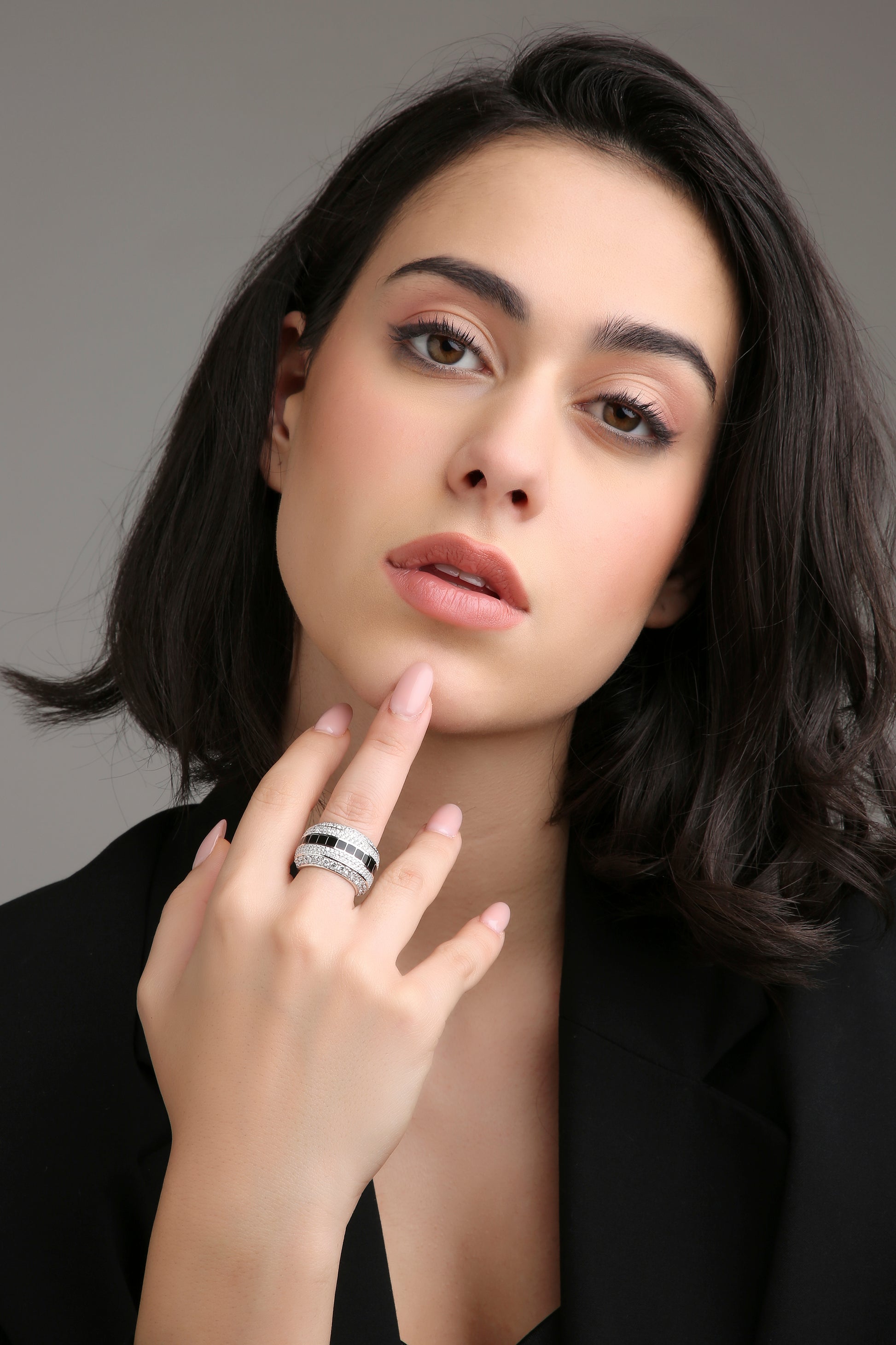 The Radiant Obsidian ring is a masterpiece of contrast and confidence. Sleek black onyx tiles are framed by rows of glittering diamonds, creating a striking balance between strength and sparkle. Crafted in polished white gold, it’s a bold symbol of elegance with an edge — made for those who define their own shine.