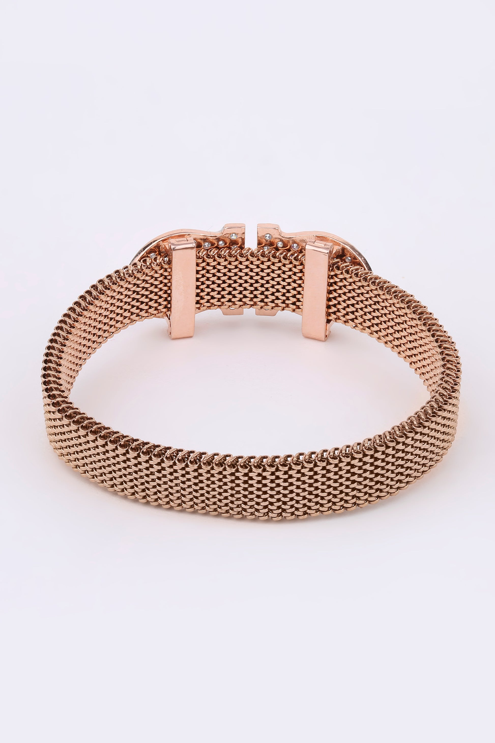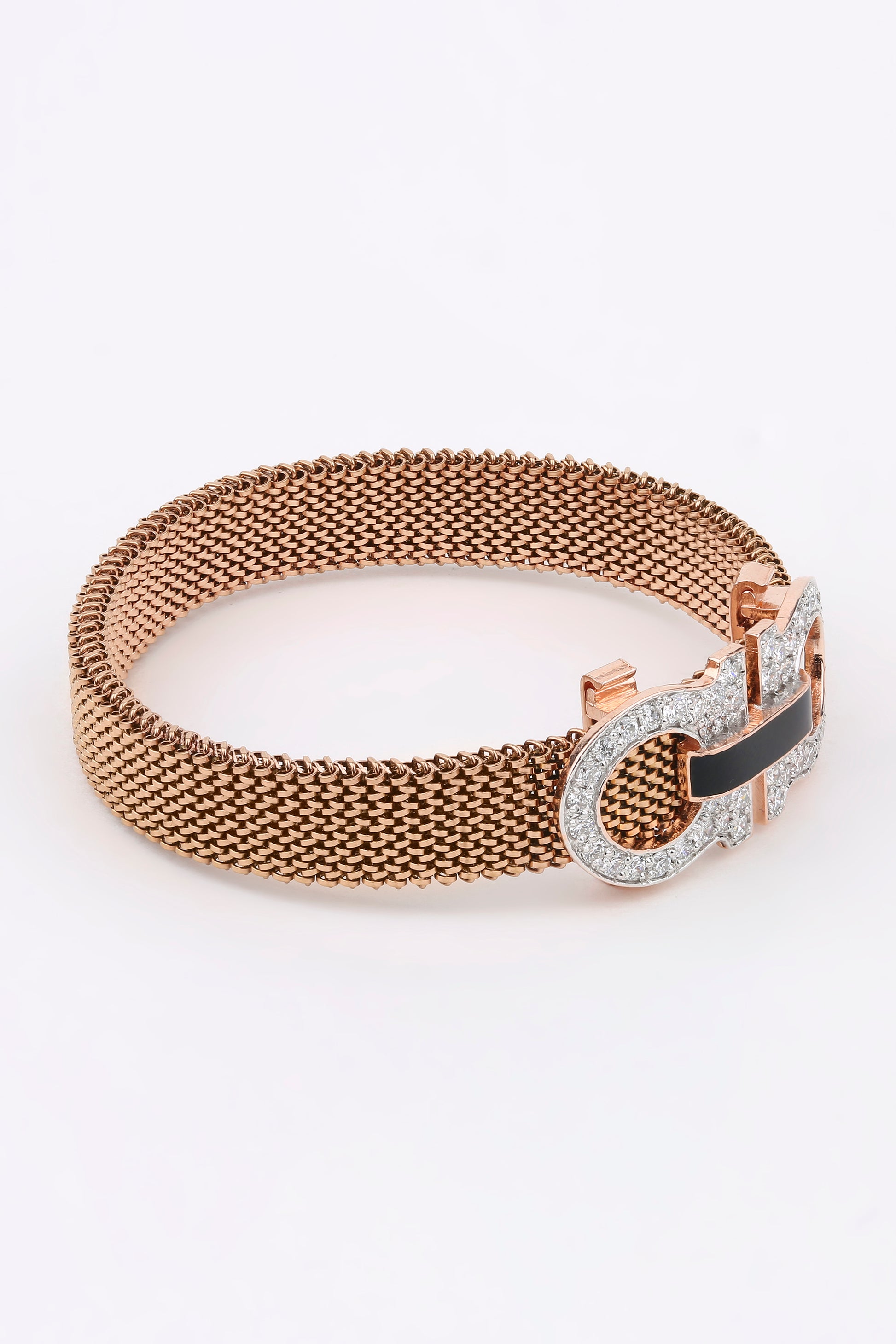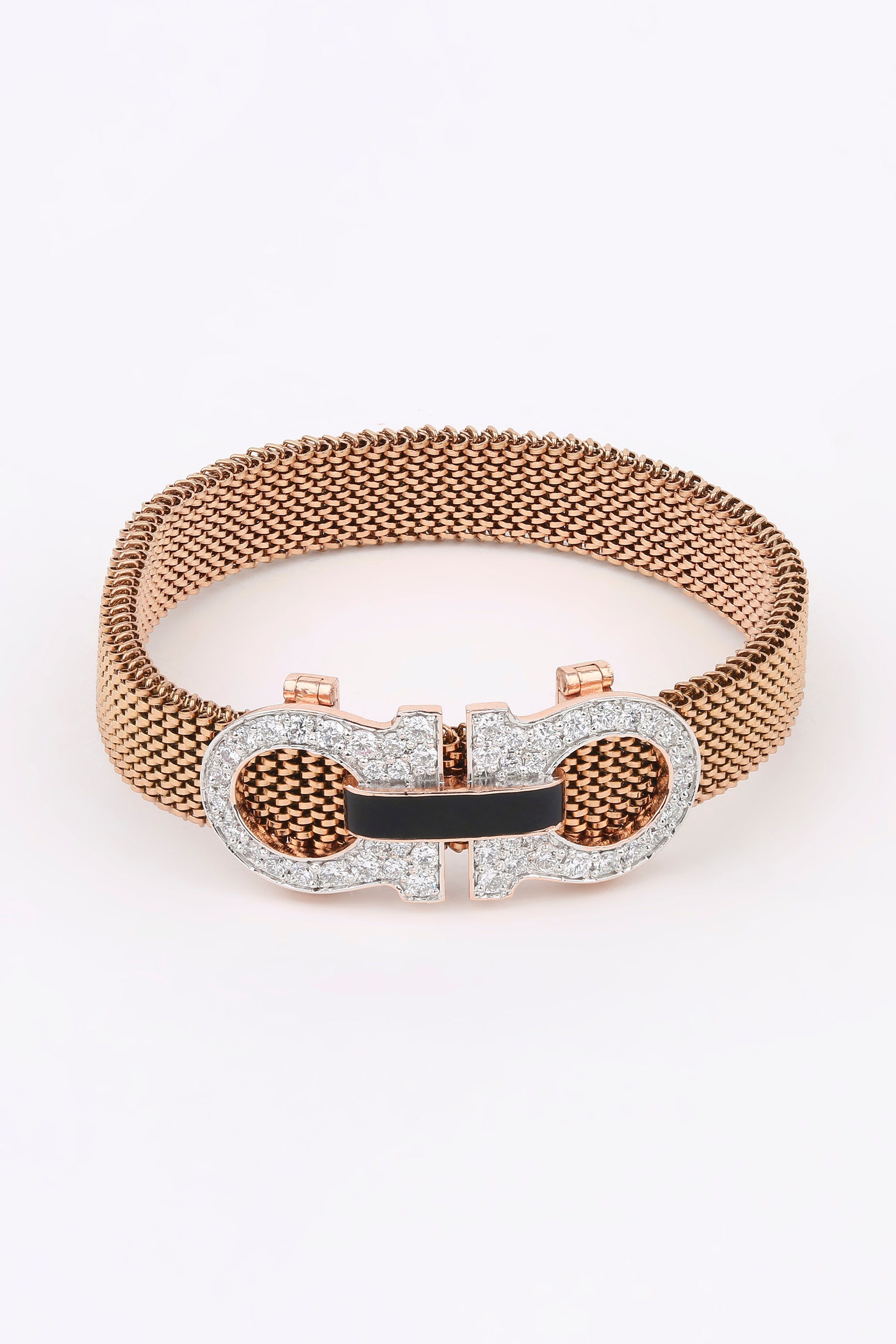 A symphony of elegance and edge, the Bloom Éclat bracelet blends rose gold finesse with a bold clasp encrusted in sparkling stones and onyx black enamel. Its intricate mesh band wraps the wrist like a whisper of luxury — refined, radiant, and unapologetically modern.
