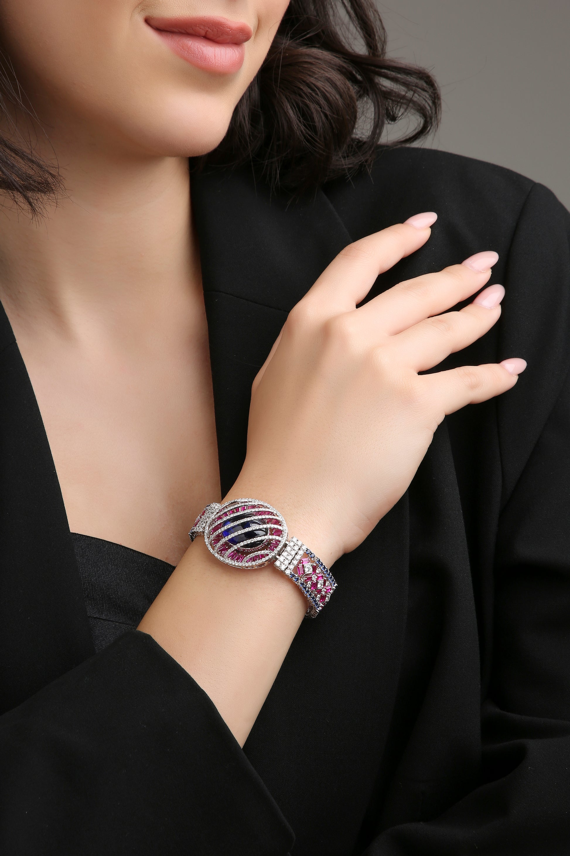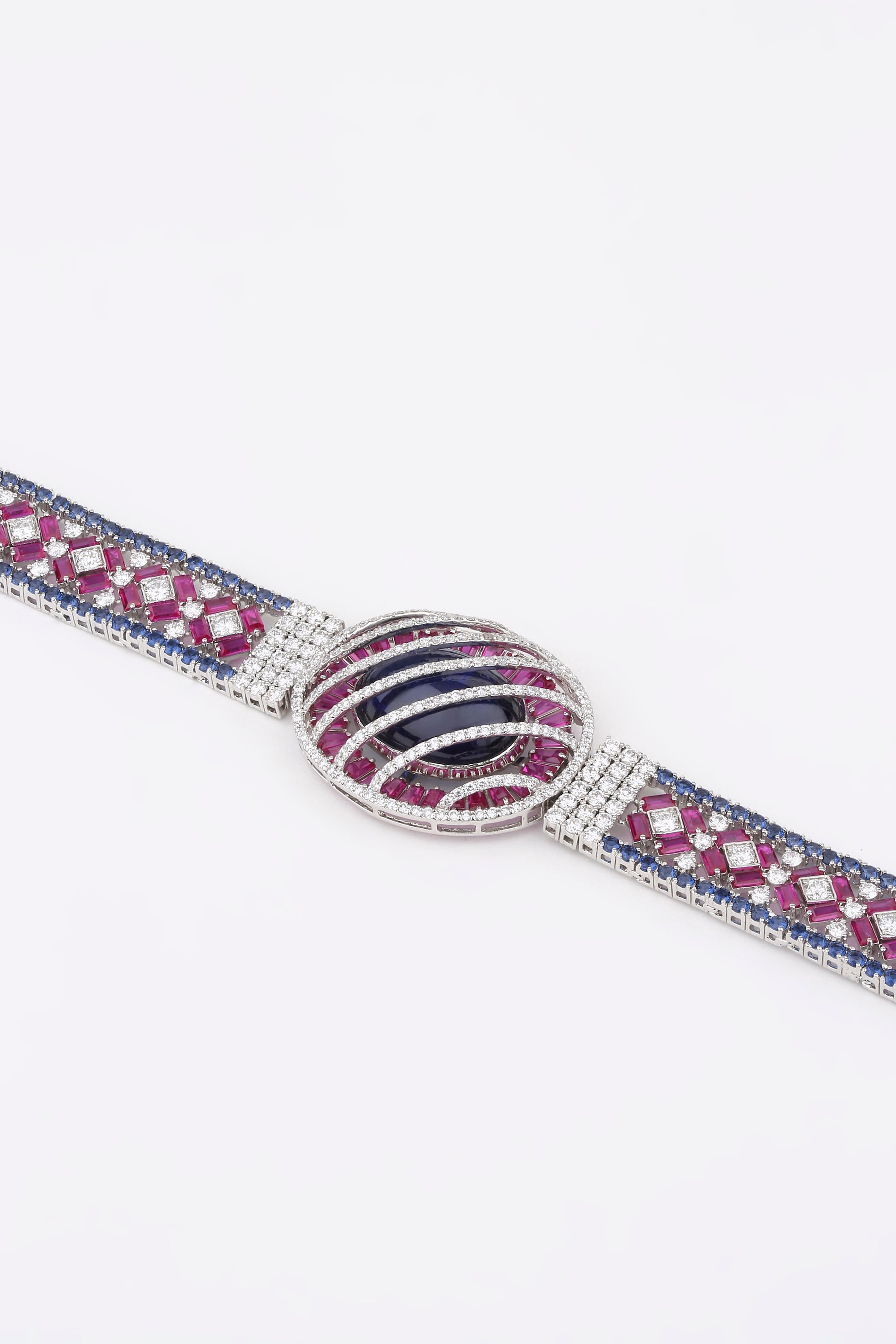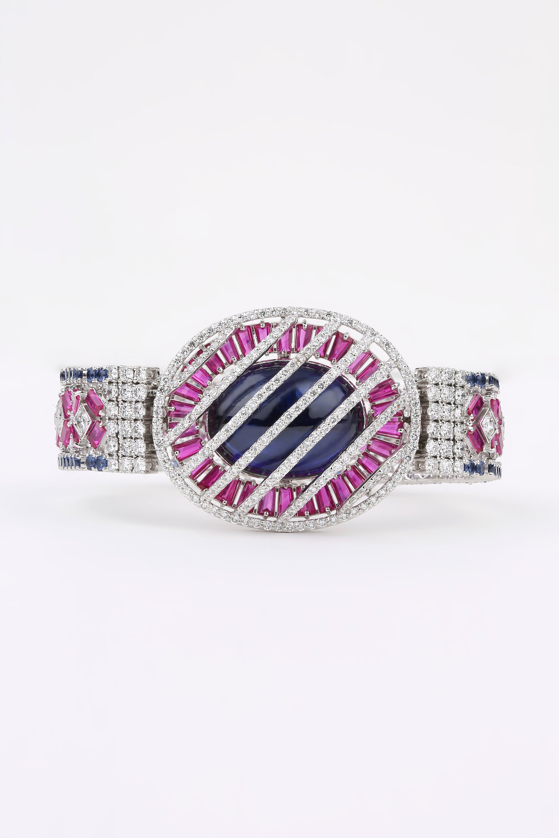 The Bloom Eclipse bracelet captures the drama of night meeting dawn — where mystery, beauty, and brilliance collide. A striking oval sapphire lies at the heart, encased in vivid pink baguette gemstones and diamond-lined bands that radiate celestial allure. Fierce yet feminine, it’s a statement of cosmic elegance — for those who dare to shine beyond boundaries.