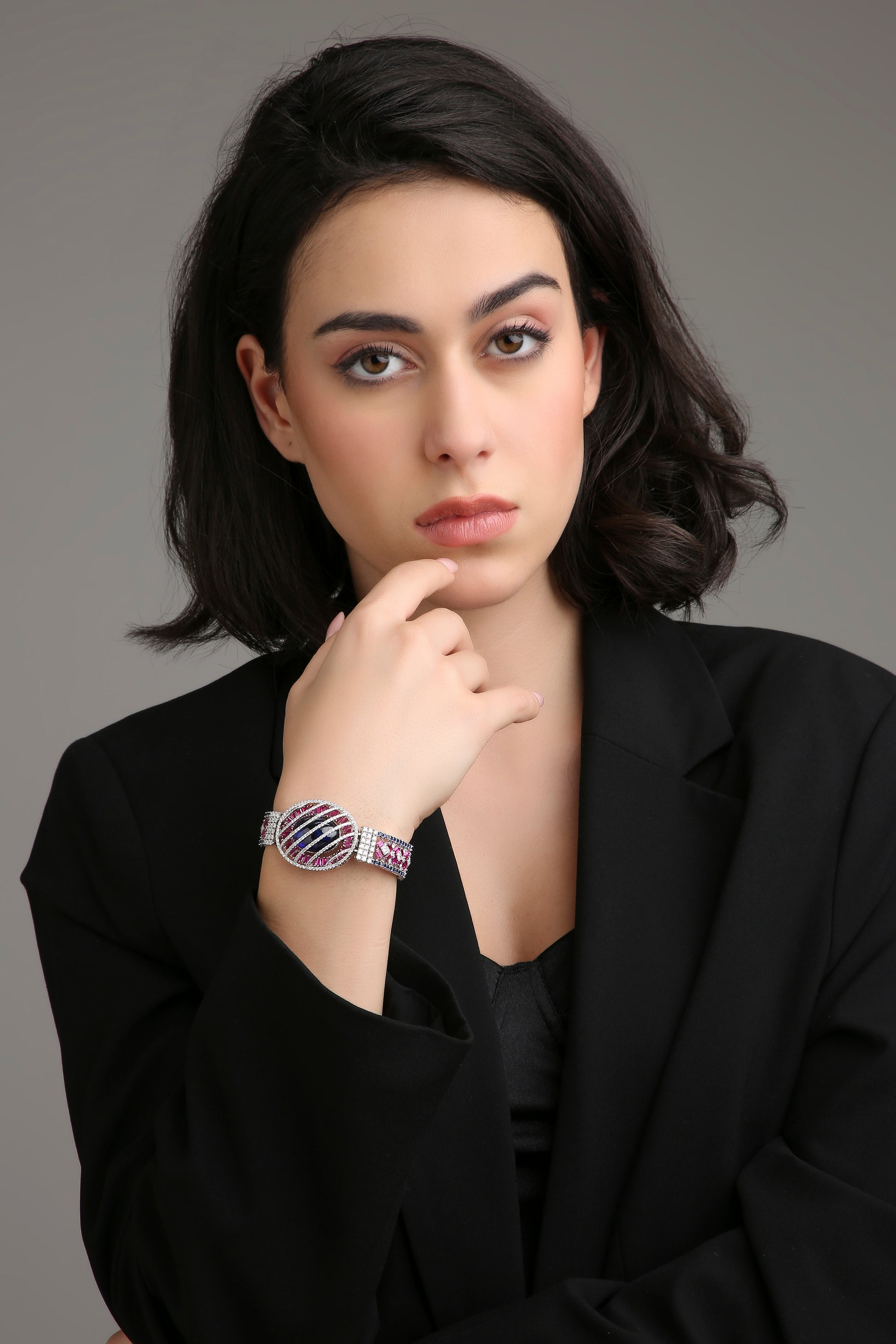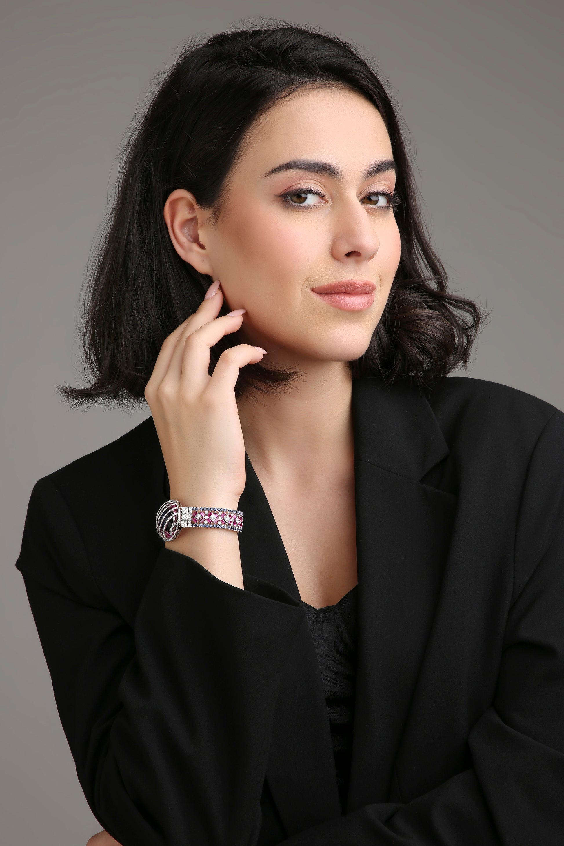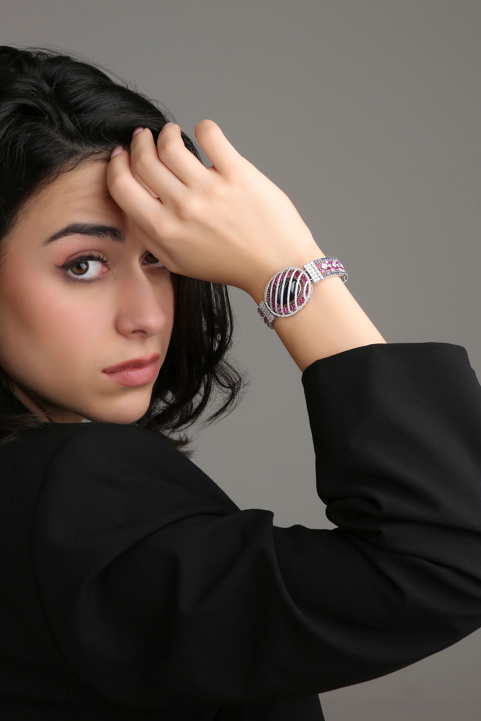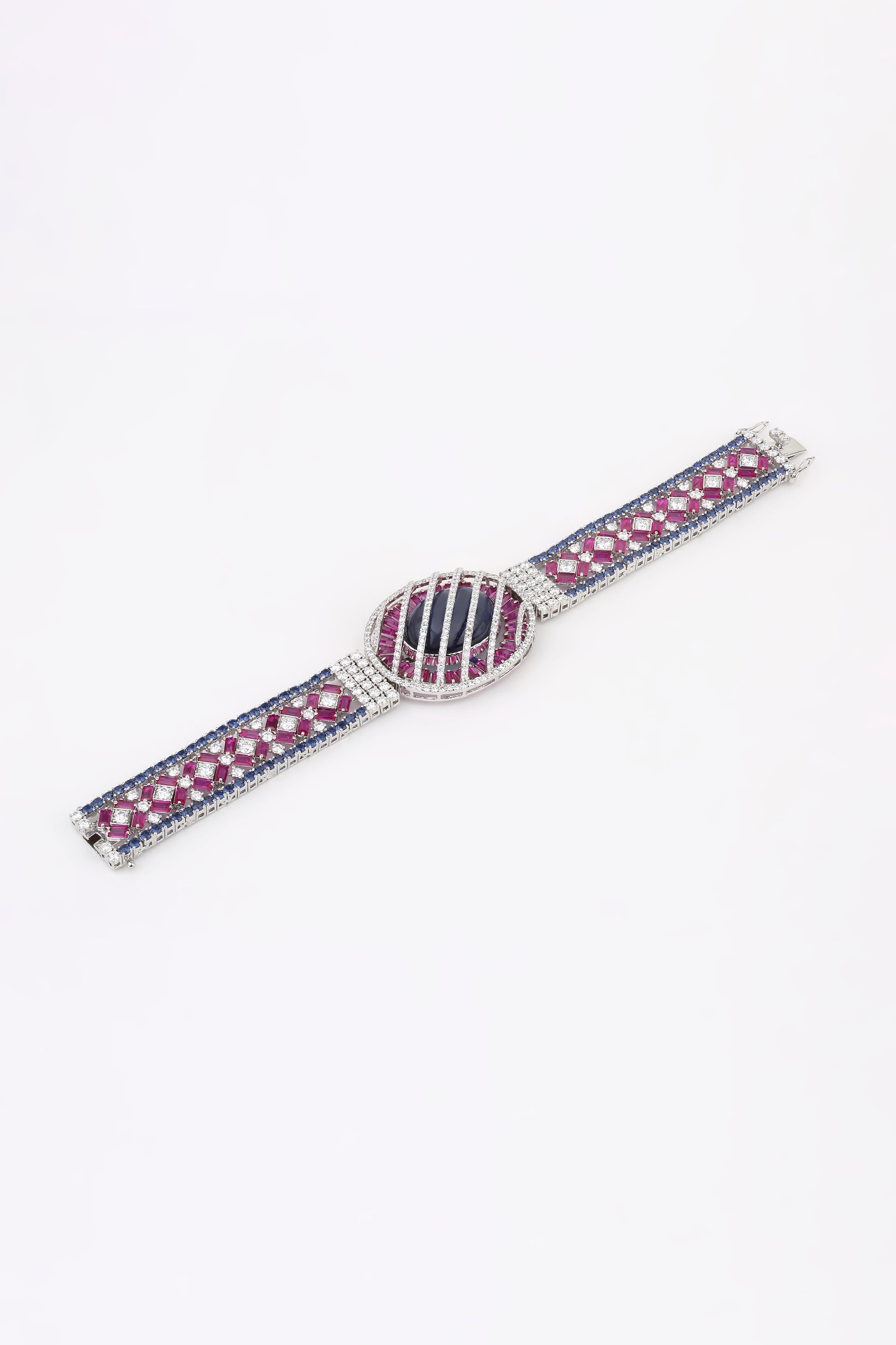 The Bloom Eclipse bracelet captures the drama of night meeting dawn — where mystery, beauty, and brilliance collide. A striking oval sapphire lies at the heart, encased in vivid pink baguette gemstones and diamond-lined bands that radiate celestial allure. Fierce yet feminine, it’s a statement of cosmic elegance — for those who dare to shine beyond boundaries.
