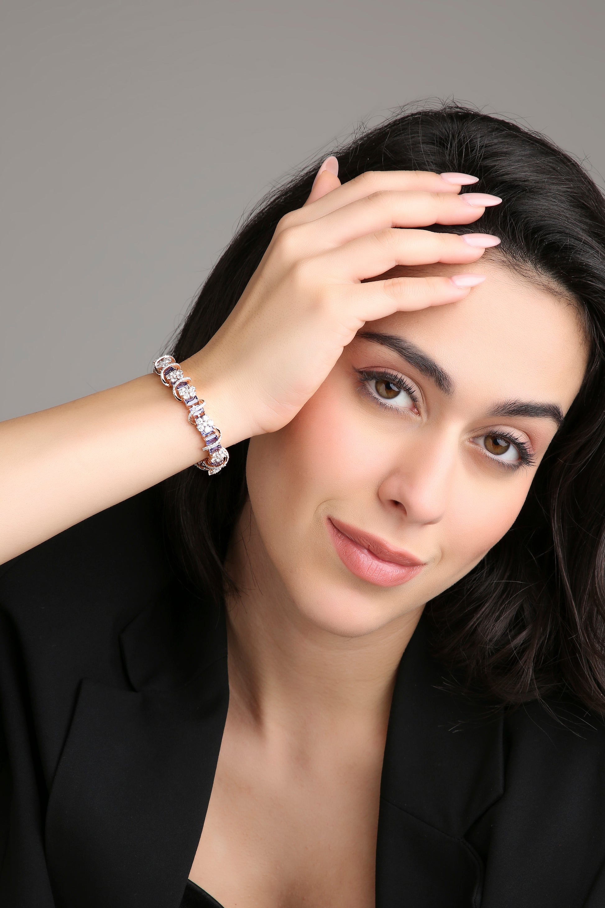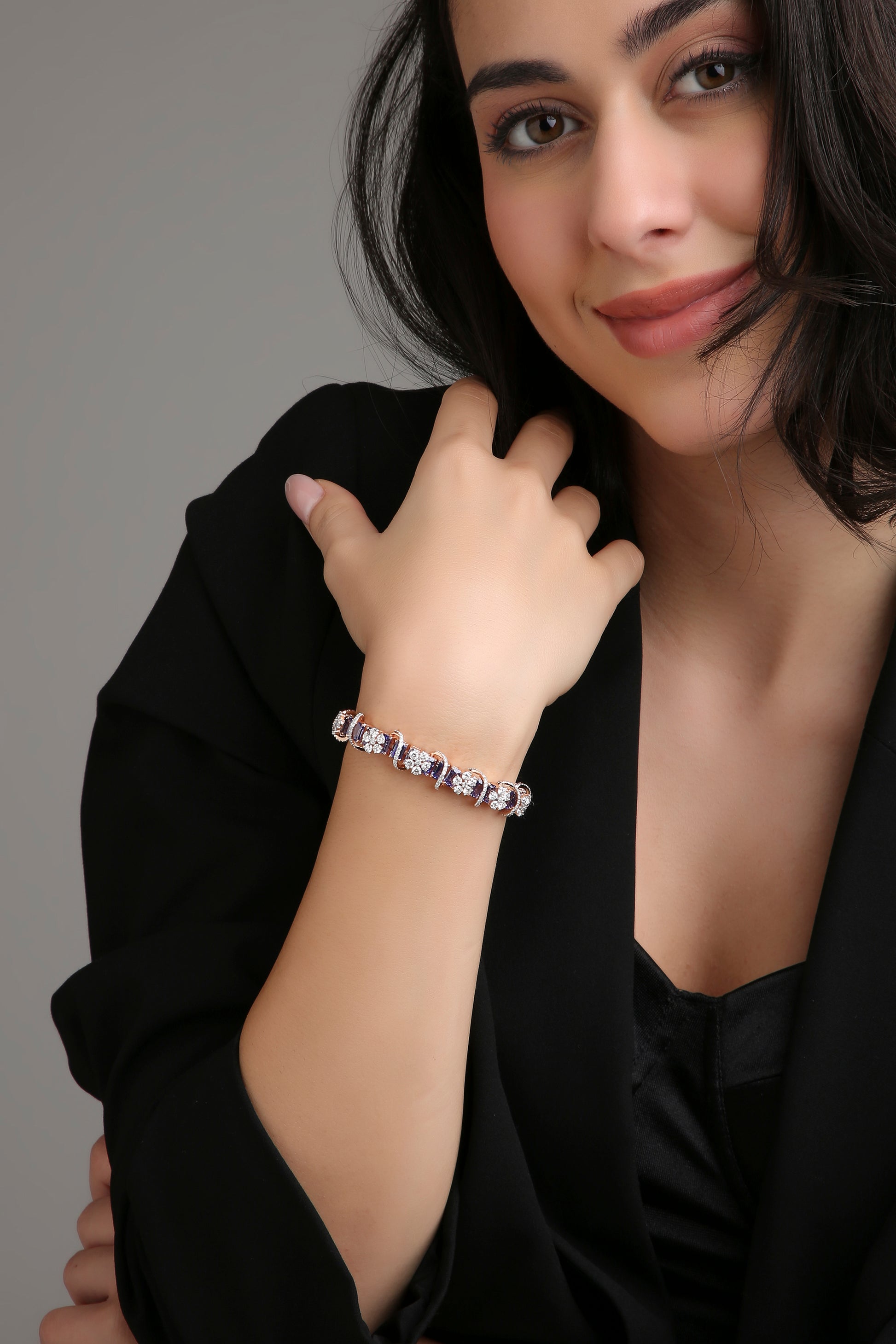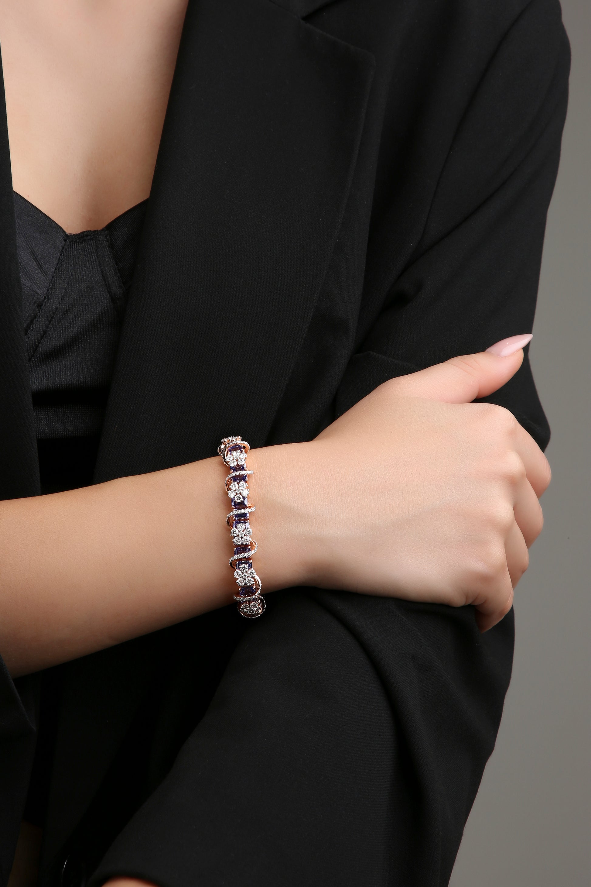 The Bloom Serenade bracelet sings of romance and grace. Crafted in rose gold, its cascading diamond blooms entwine around a row of violet-hued gemstones, creating a symphony of sparkle and softness. Each curve flows like a melody, celebrating beauty in motion — a poetic piece for the woman who glows with quiet confidence and timeless allure.