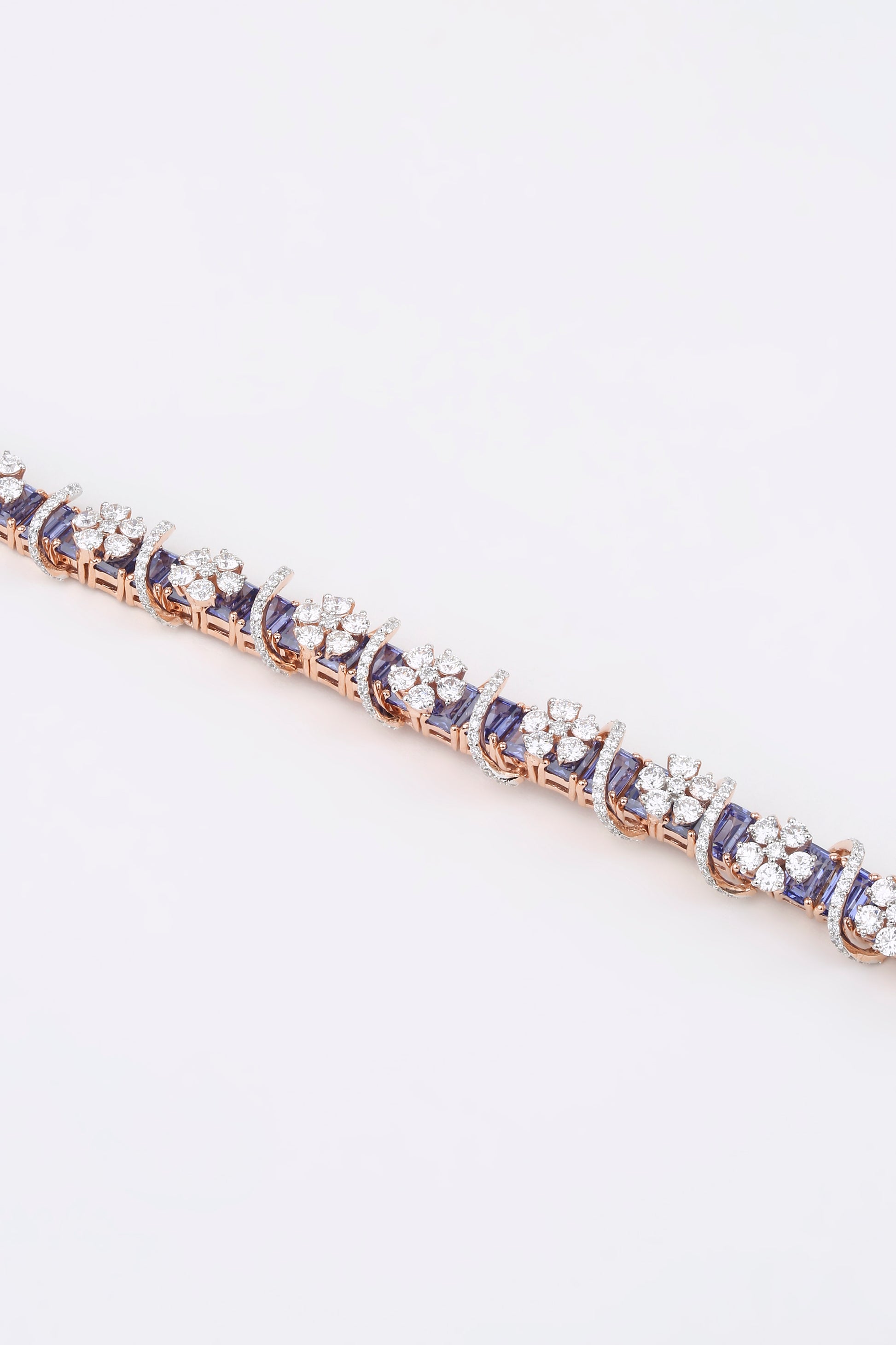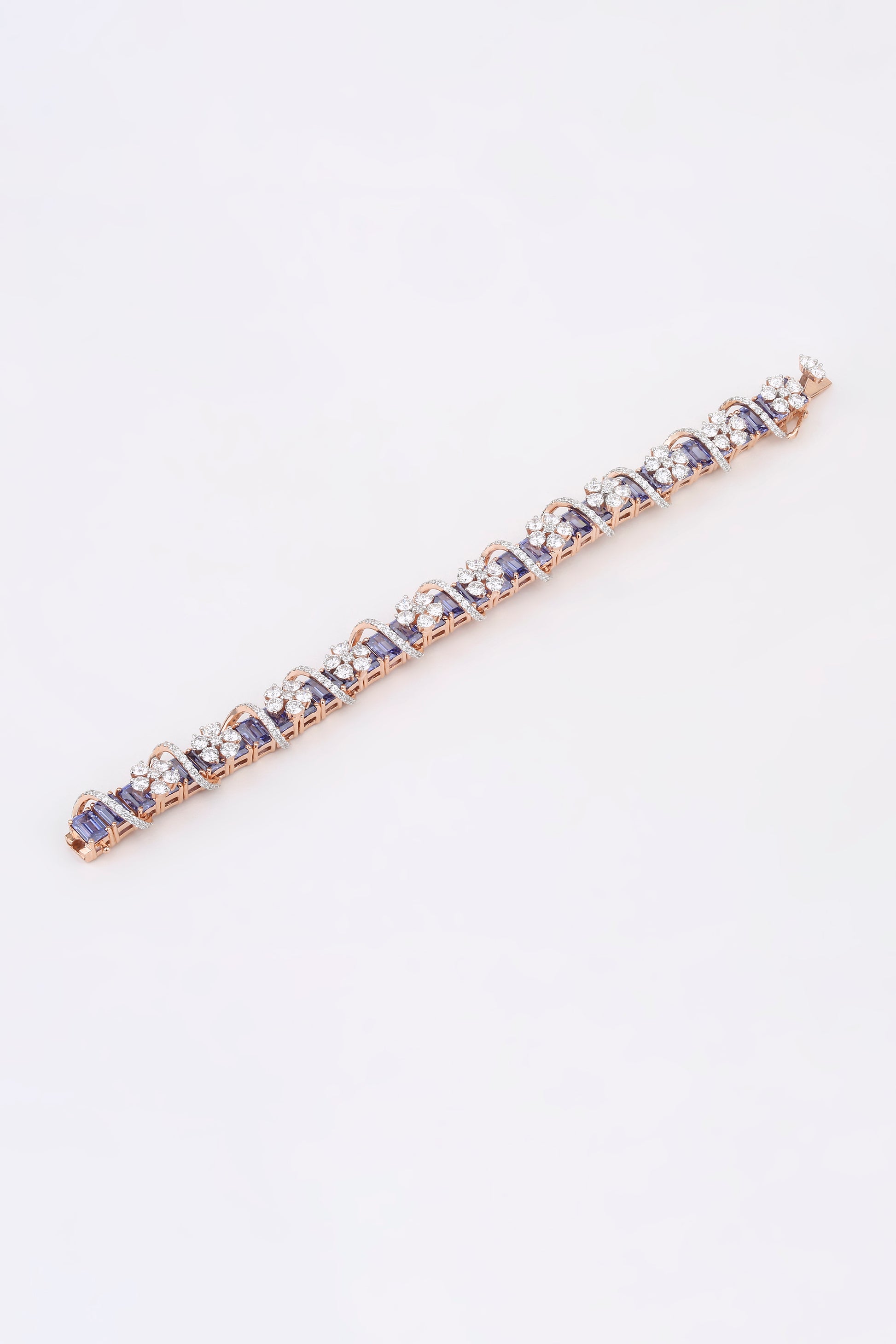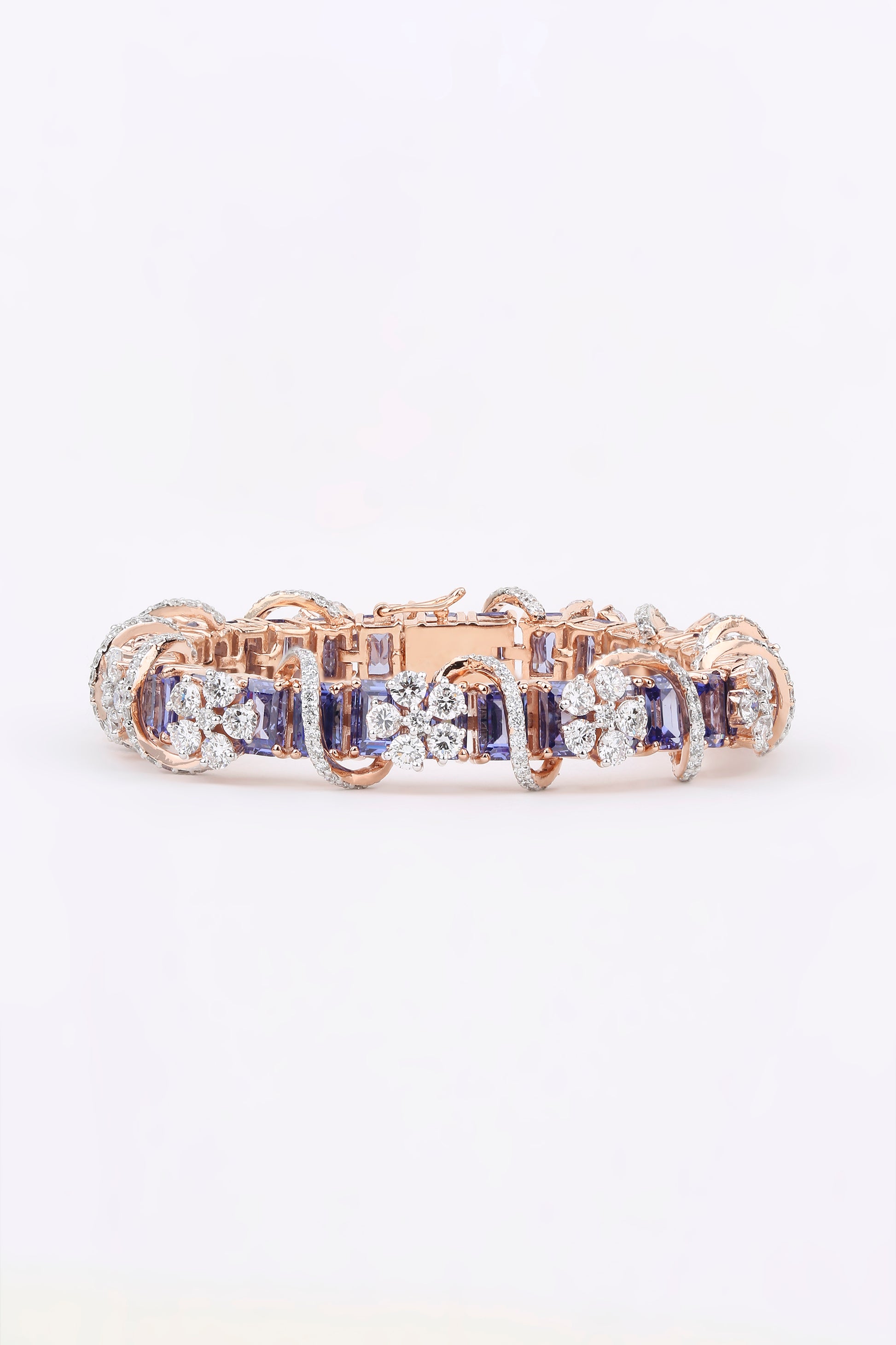 The Bloom Serenade bracelet sings of romance and grace. Crafted in rose gold, its cascading diamond blooms entwine around a row of violet-hued gemstones, creating a symphony of sparkle and softness. Each curve flows like a melody, celebrating beauty in motion — a poetic piece for the woman who glows with quiet confidence and timeless allure.