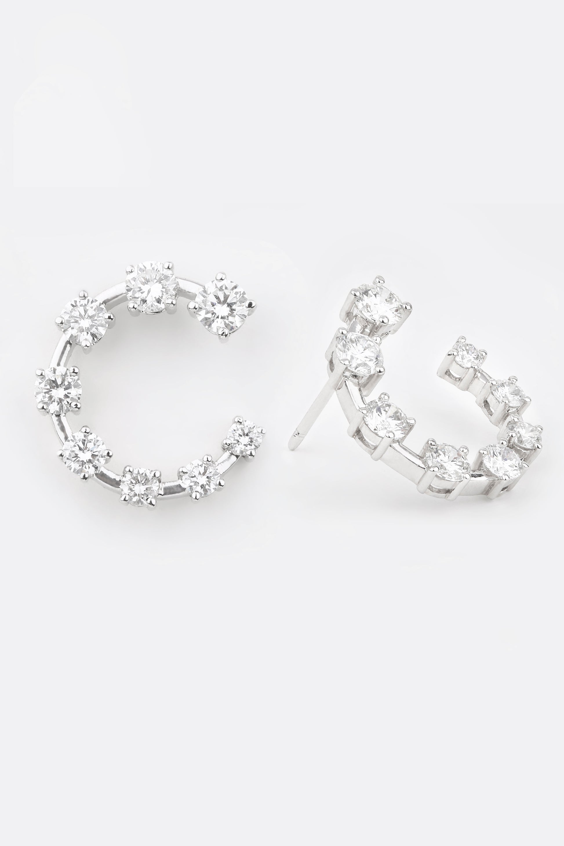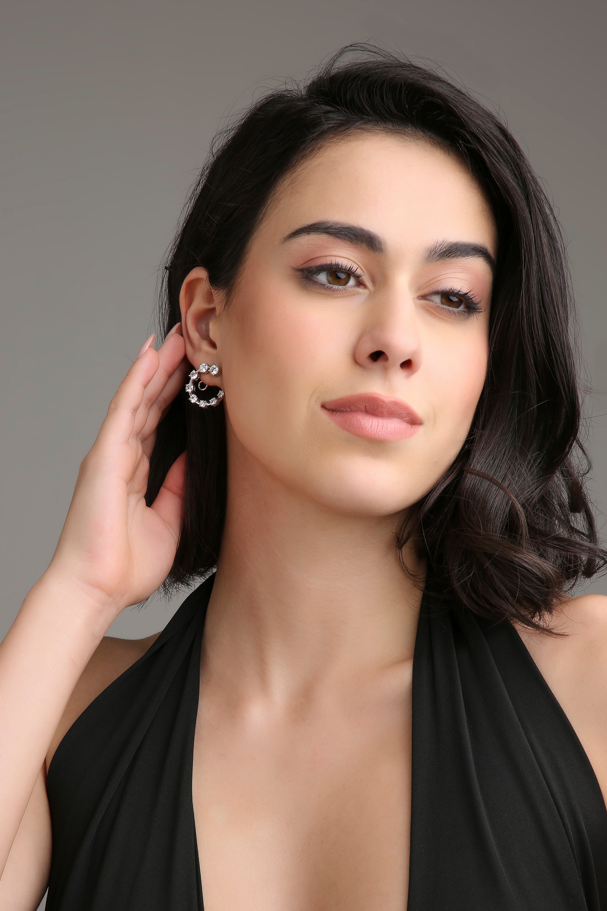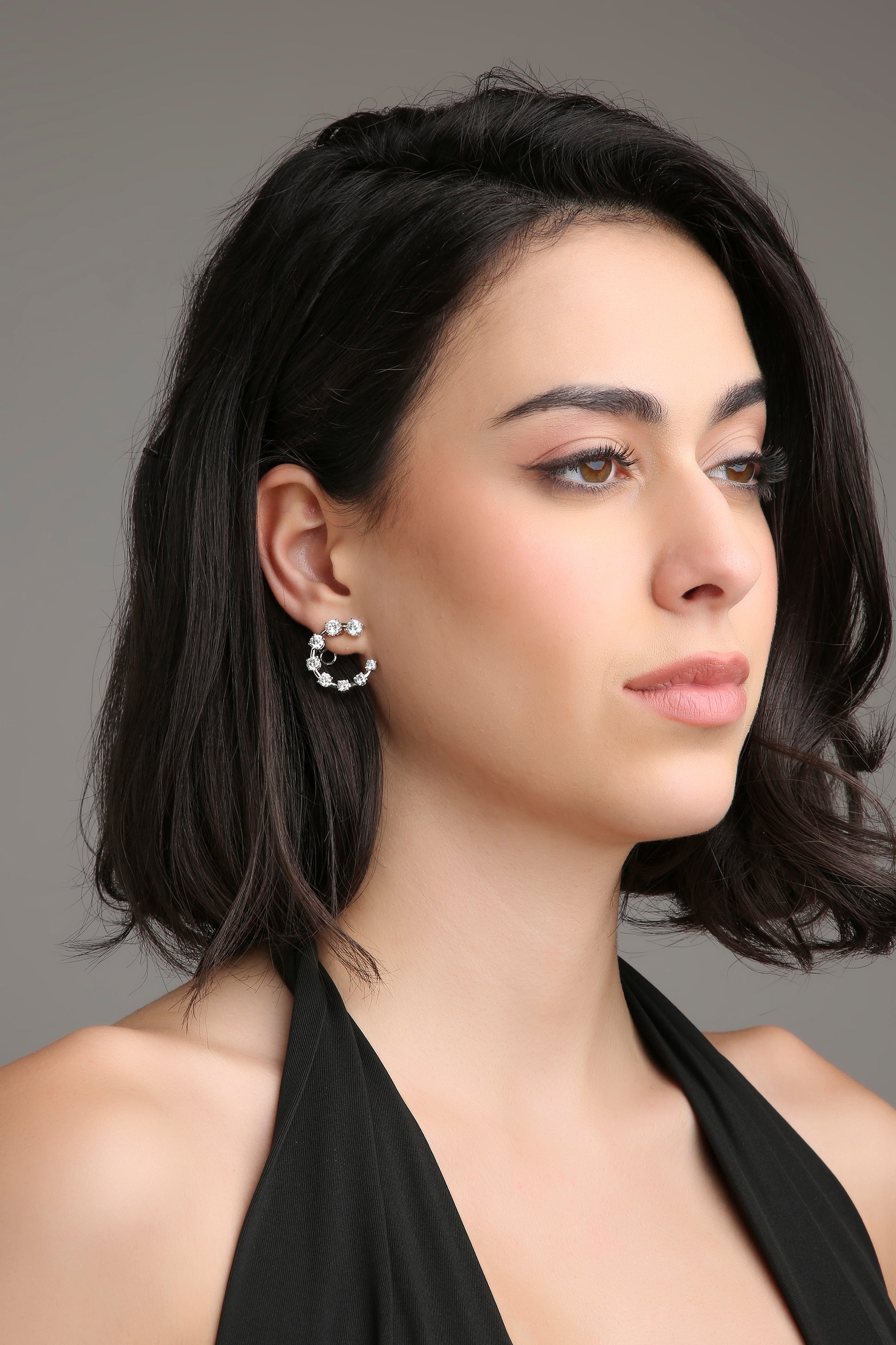 The Evora Celeste earrings capture the elegance of the night sky in motion. With a crescent-inspired design lined with radiant stones, they reflect light from every angle — creating a soft, ethereal glow. Minimal yet mesmerizing, these earrings embody refined sophistication for those who believe true beauty lies in subtle brilliance.
