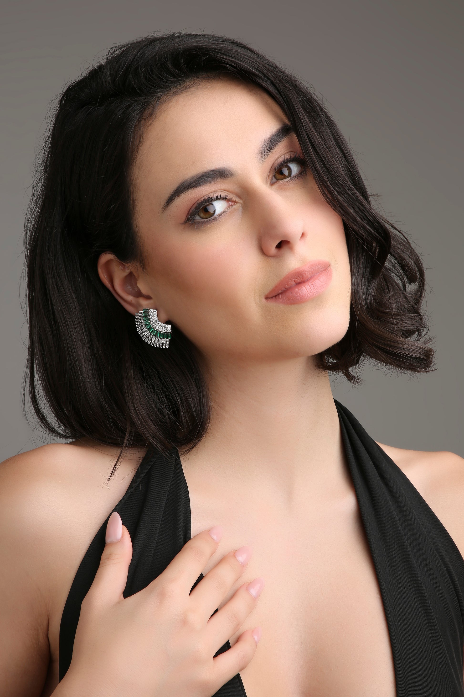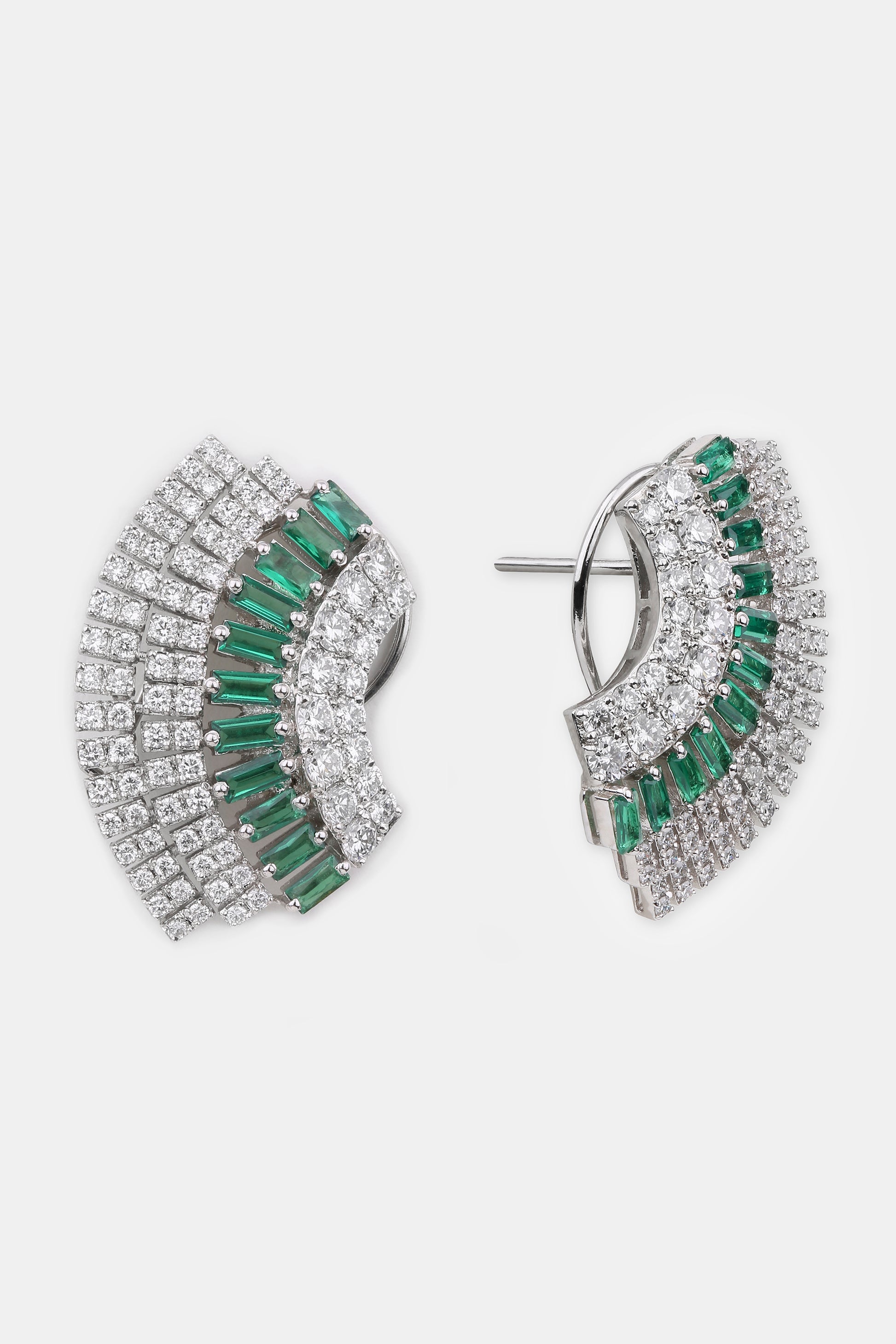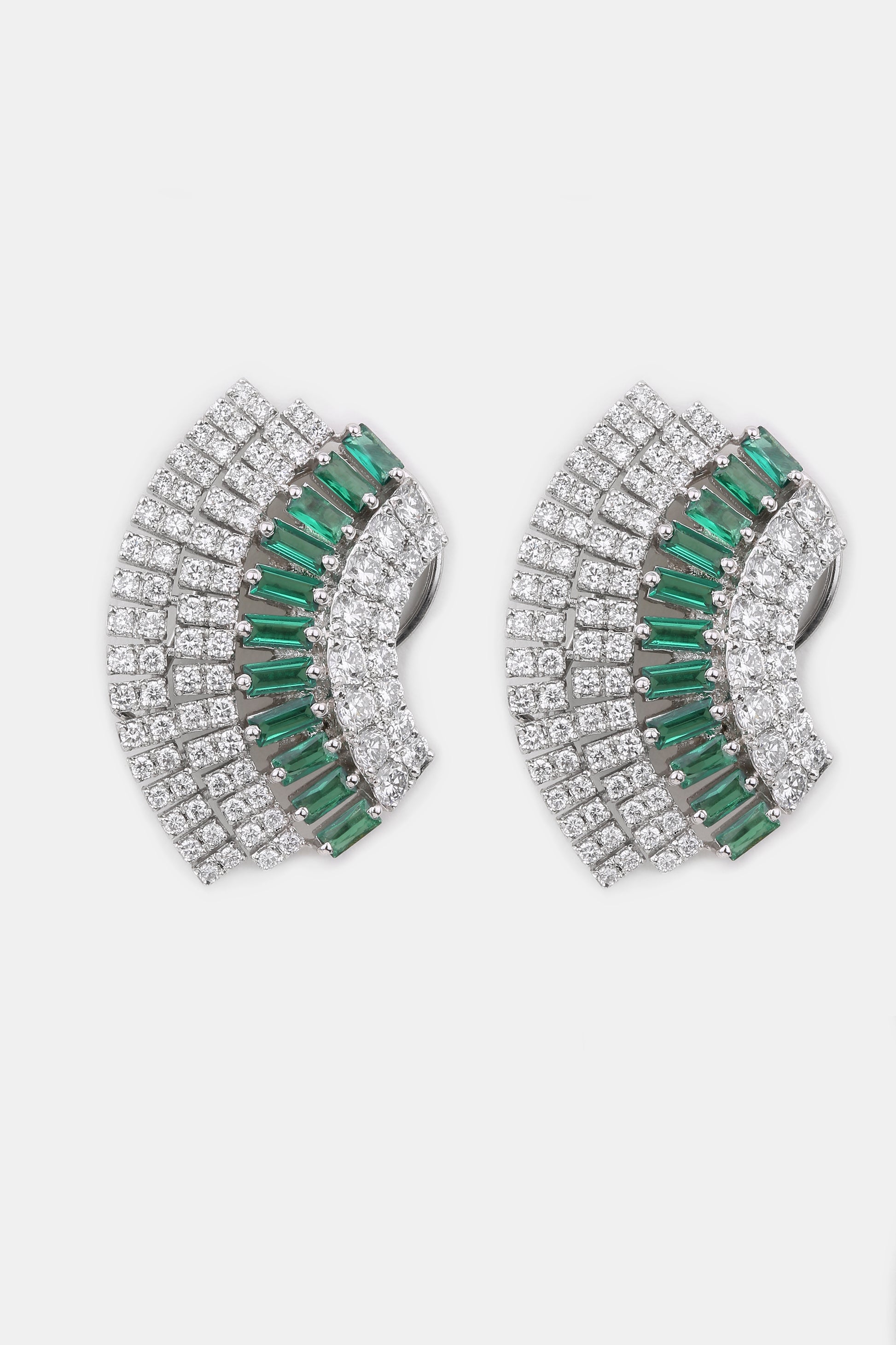 The Evora Emeraldine earrings are a masterpiece of grandeur and precision. Featuring rows of radiant baguette-cut emeralds embraced by cascading halos of brilliant white stones, their fan-shaped design captures movement and majesty in perfect sync. Bold, regal, and exquisitely detailed — these earrings are a statement of timeless elegance and modern luxury.