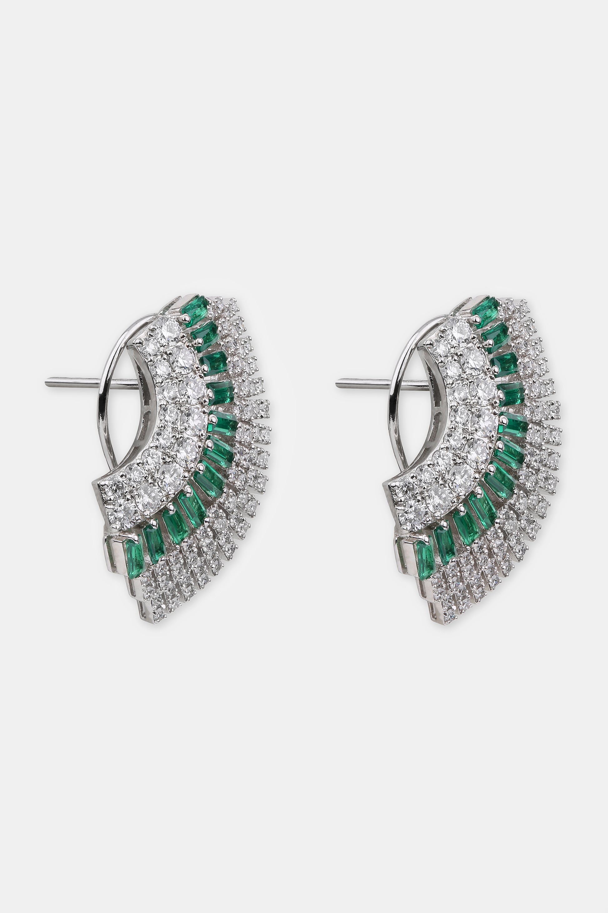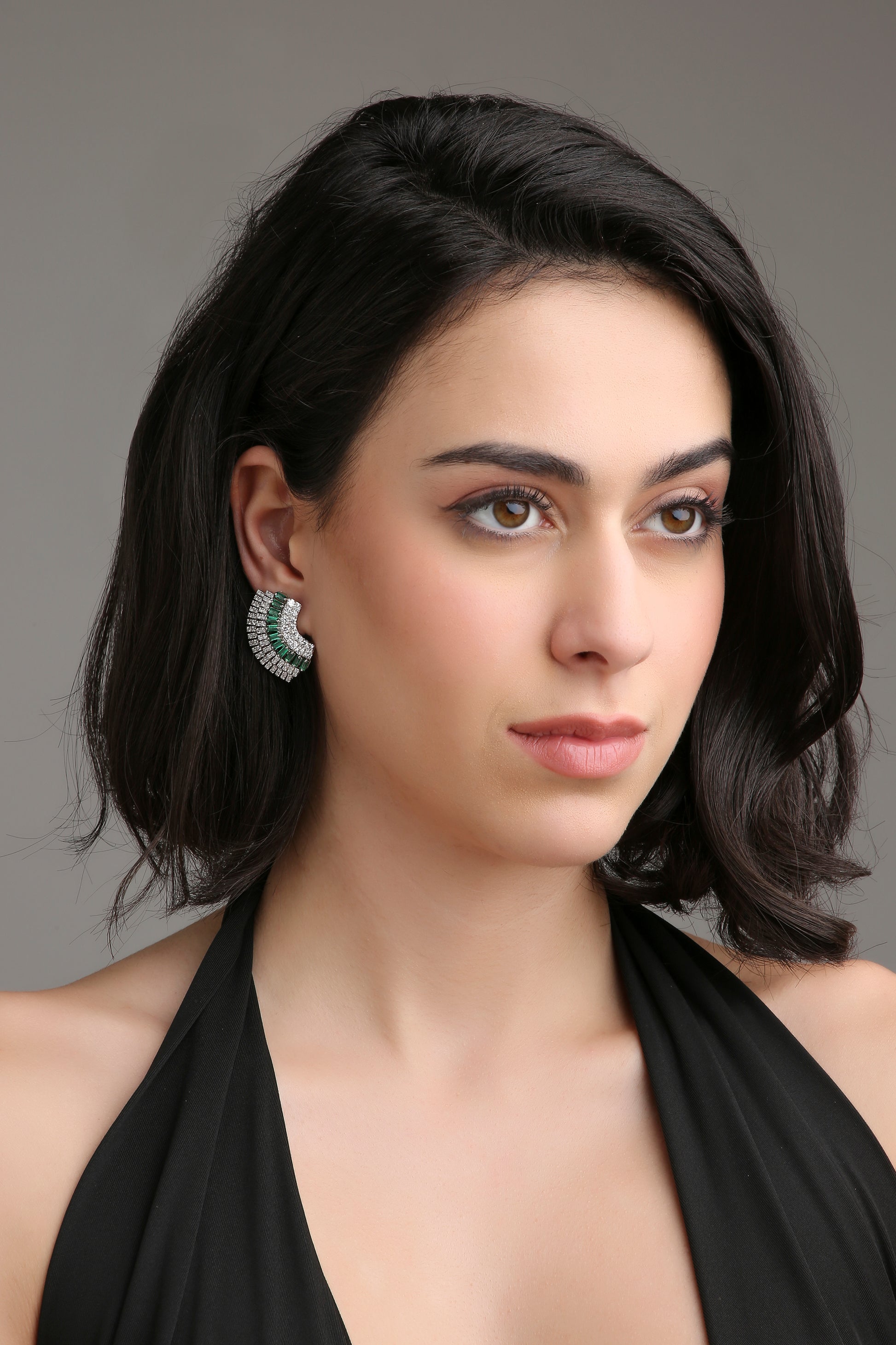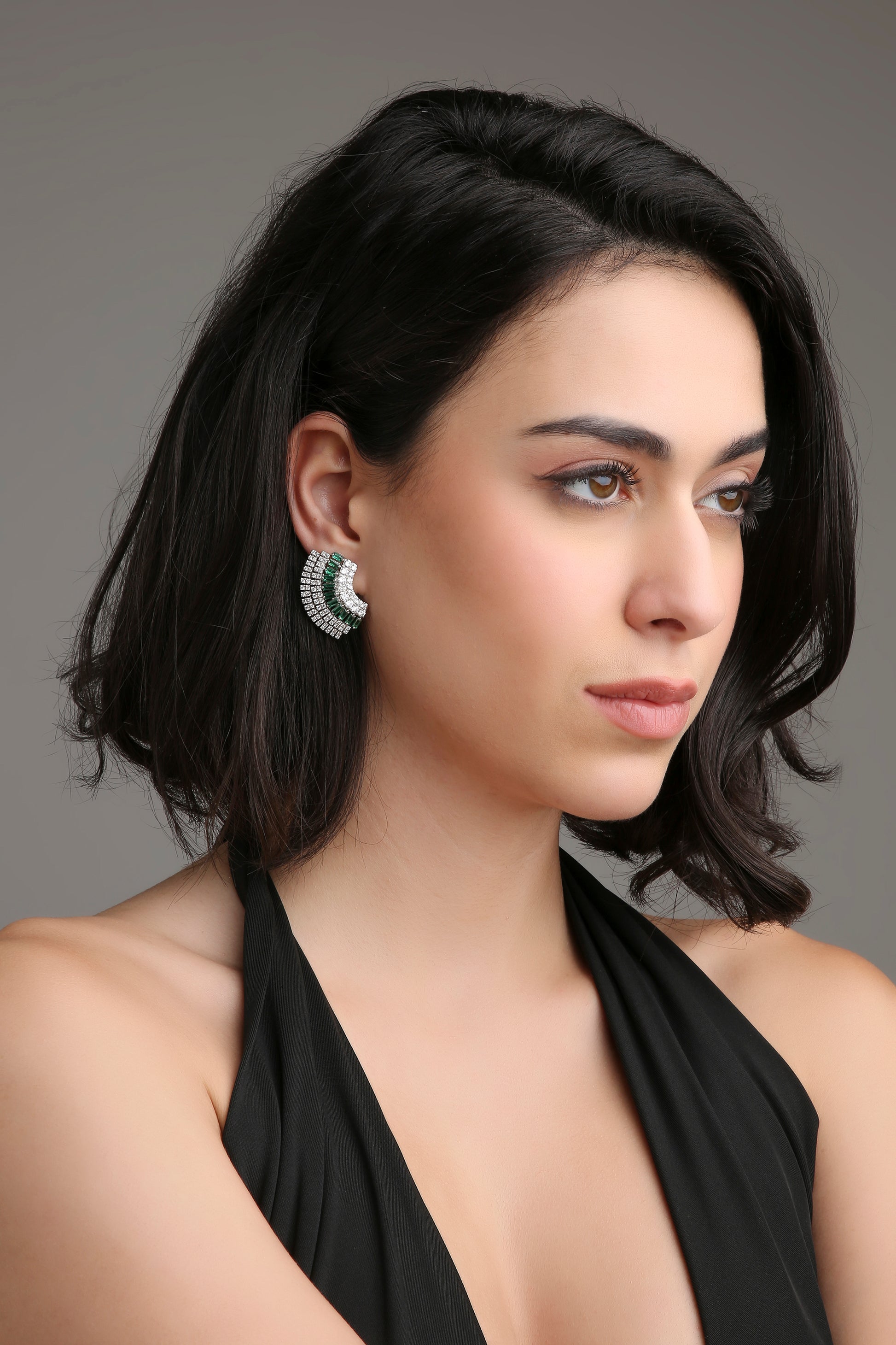 The Evora Emeraldine earrings are a masterpiece of grandeur and precision. Featuring rows of radiant baguette-cut emeralds embraced by cascading halos of brilliant white stones, their fan-shaped design captures movement and majesty in perfect sync. Bold, regal, and exquisitely detailed — these earrings are a statement of timeless elegance and modern luxury.