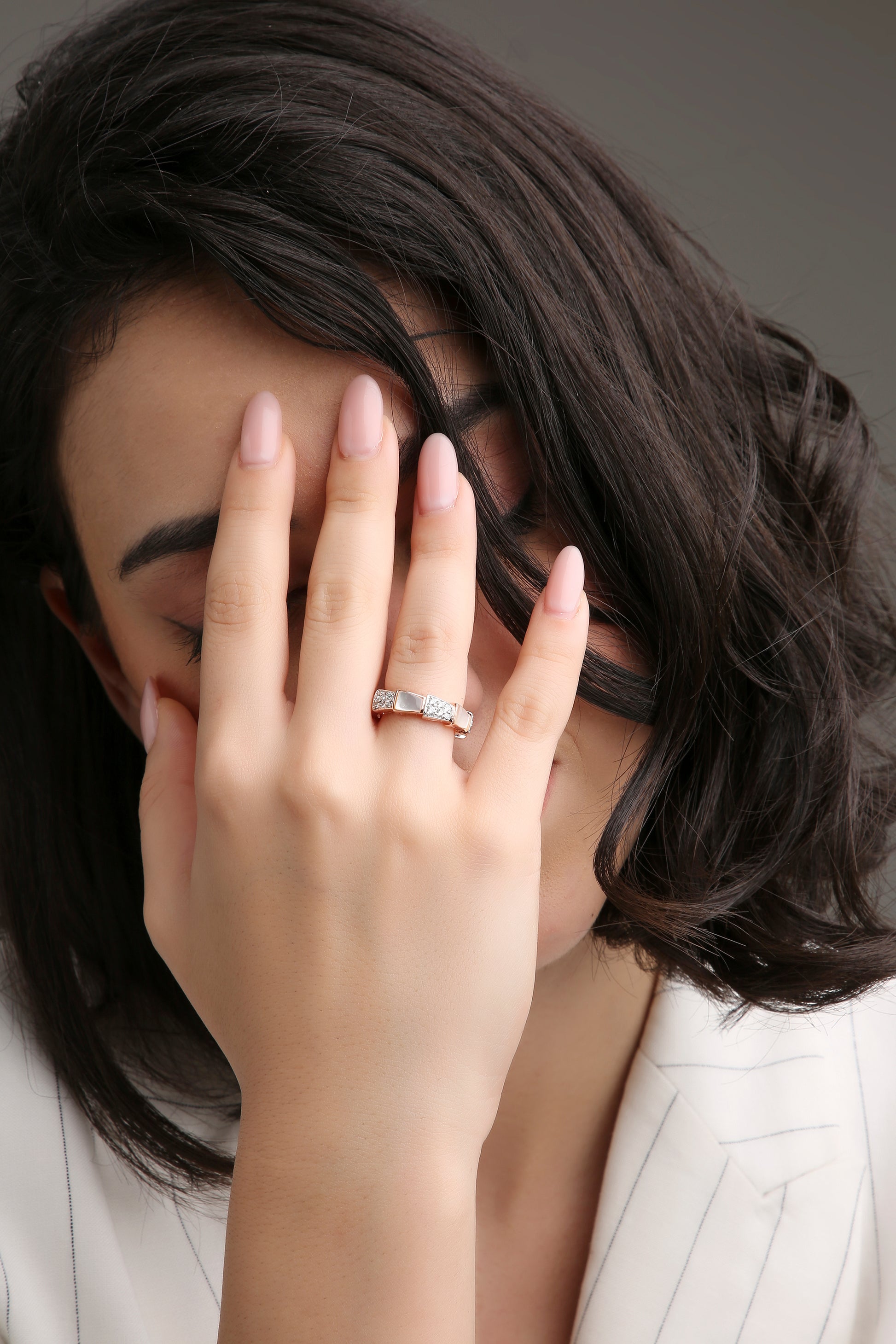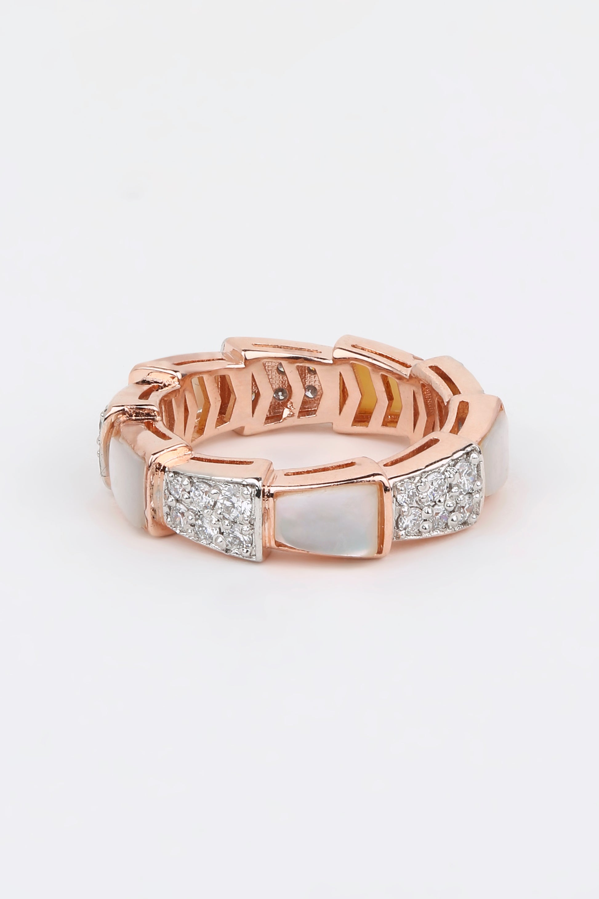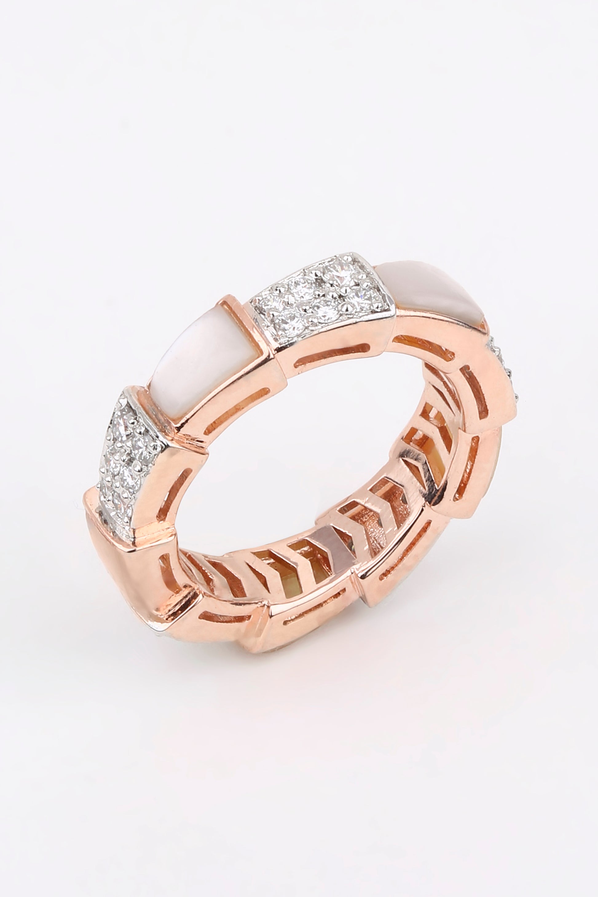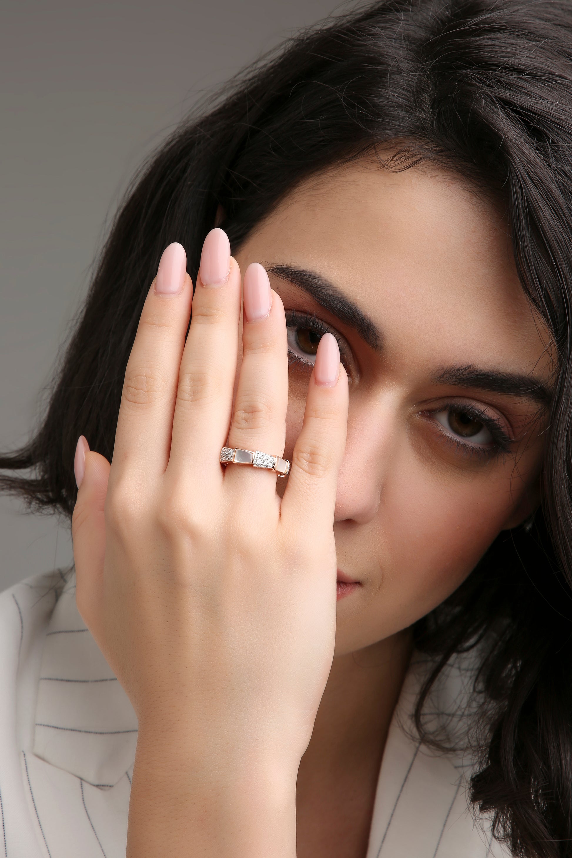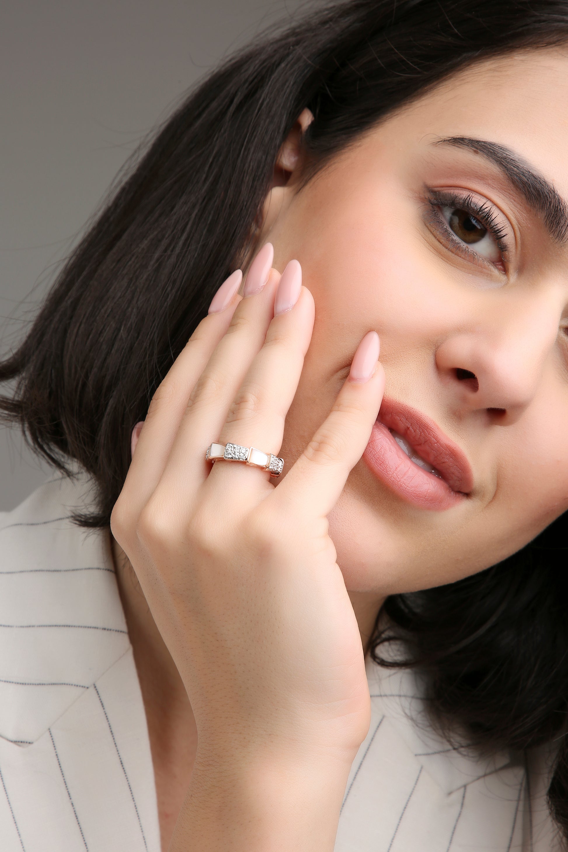 The Radiant Vogue ring is a celebration of chic modern design. With alternating segments of luminous white enamel and pavé-set diamonds framed in rose gold, it exudes balance, confidence, and timeless allure. Bold yet refined — it’s the perfect statement for those who define elegance on their own terms.